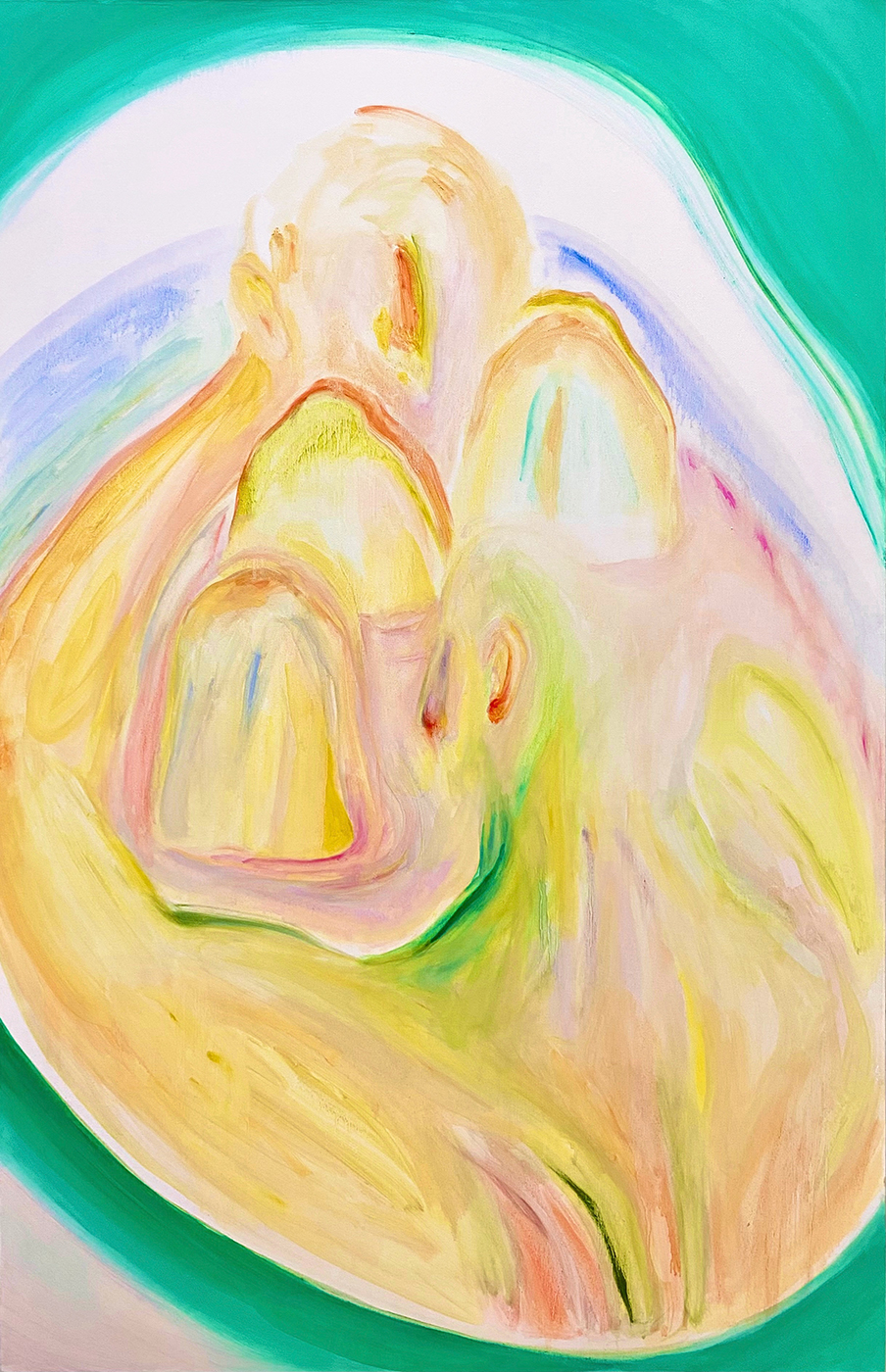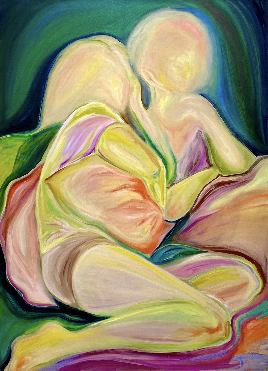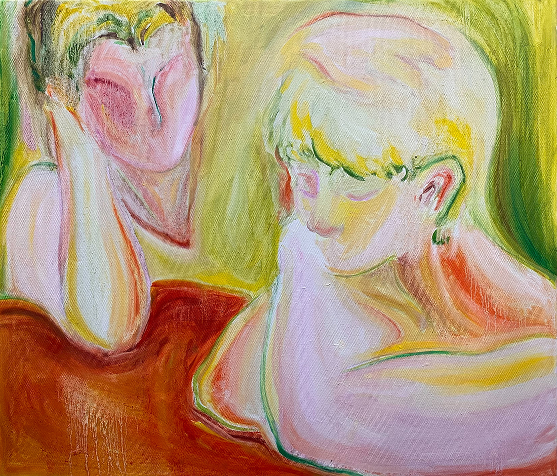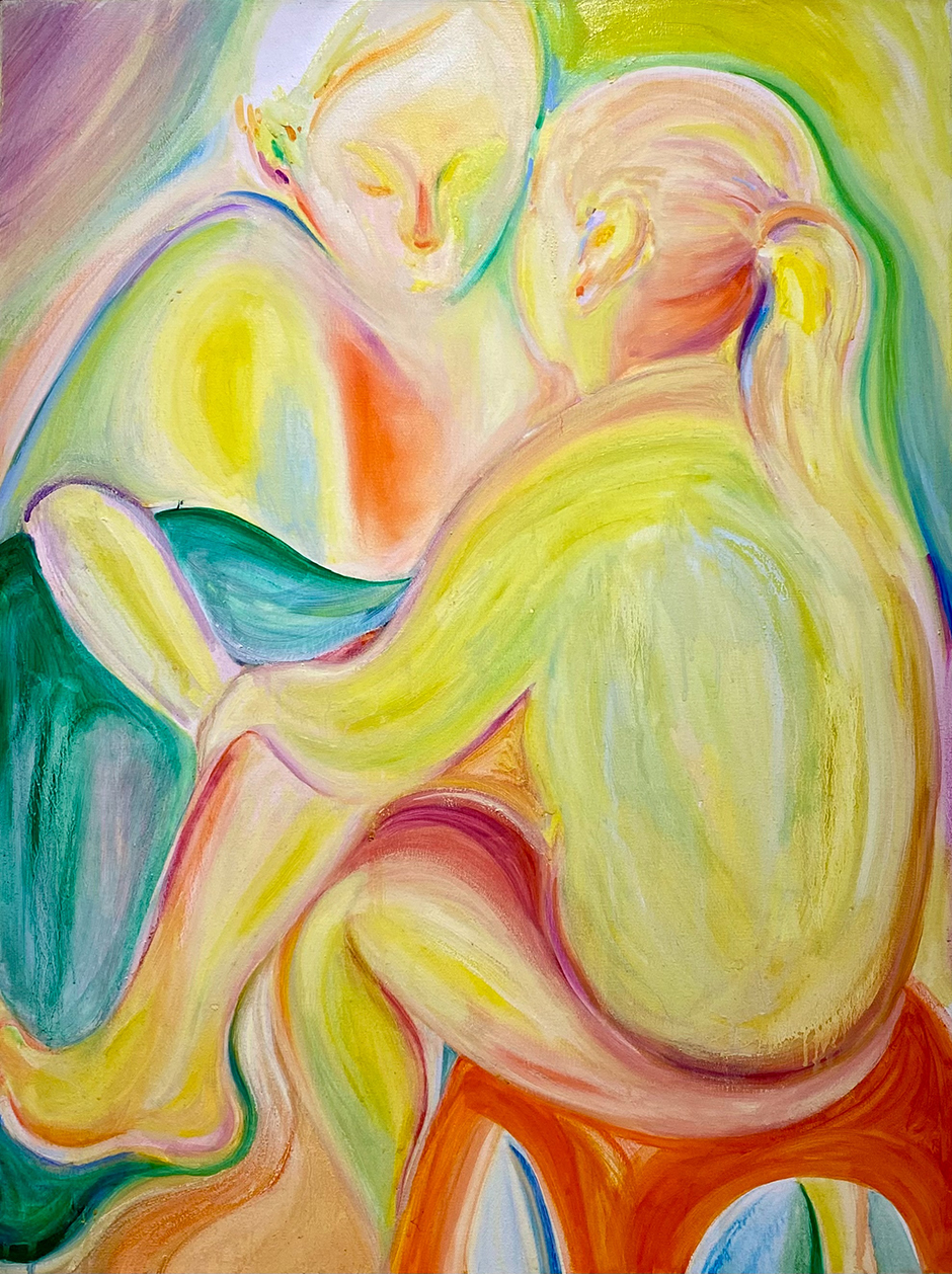 以柔和、朦朧的油彩筆觸捕捉日常生活與親密關係中的微小瞬間。她以「觸摸」作為創作起點,連結記憶中的情感對象,並透過流暢有機的線條與曖昧簡化的人物形象,營造出一種「無需犧牲的親密所在」。冷暖交錯的色彩語言如同情感間的平衡與調和,構築出既靠近又保有個體獨特性的親密動態。