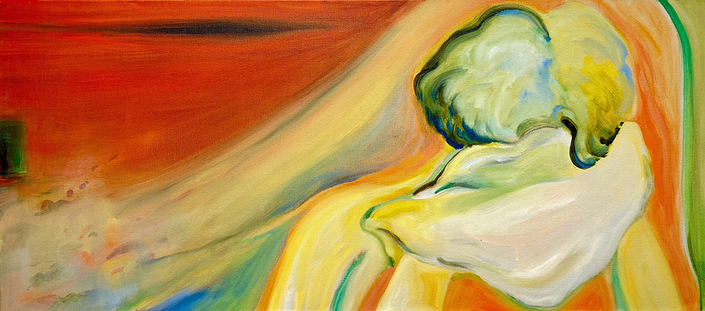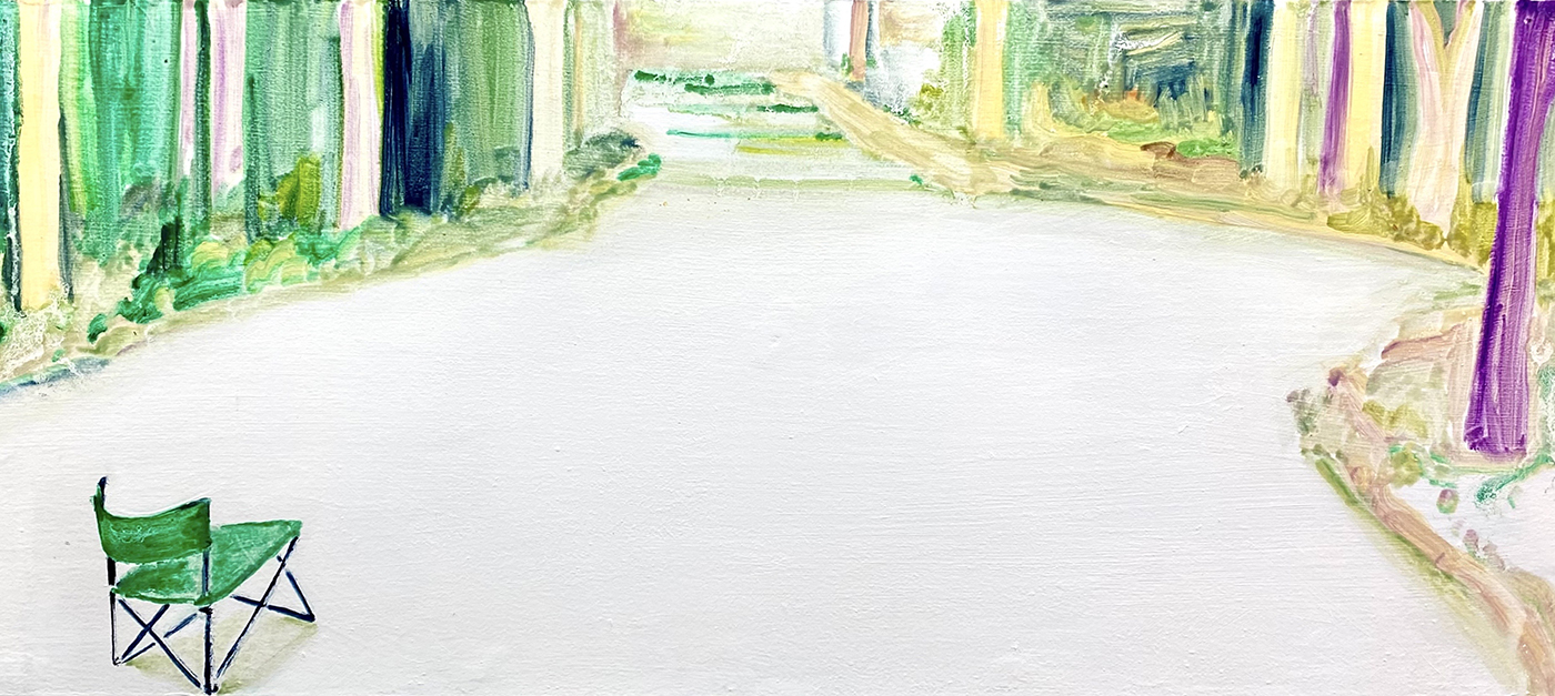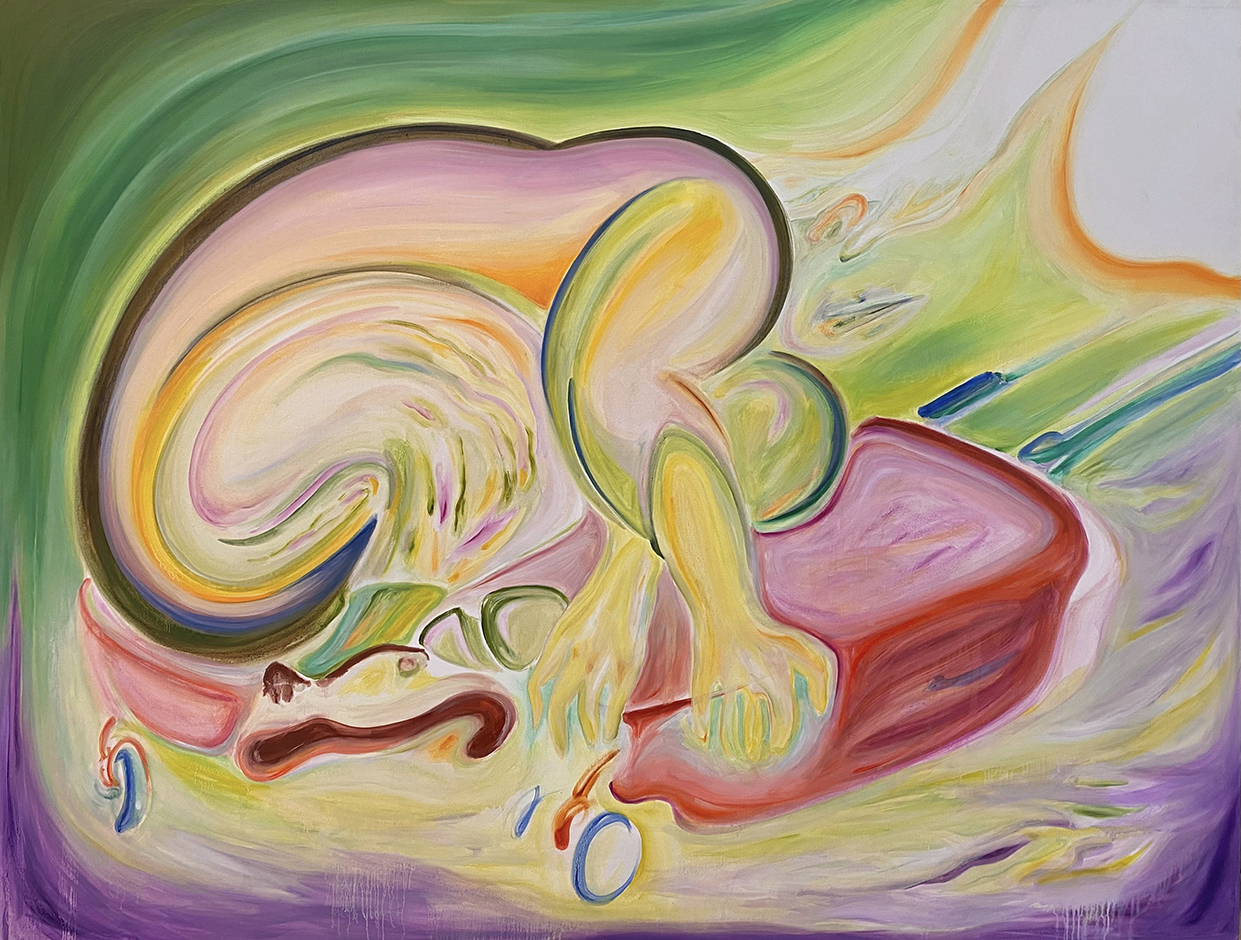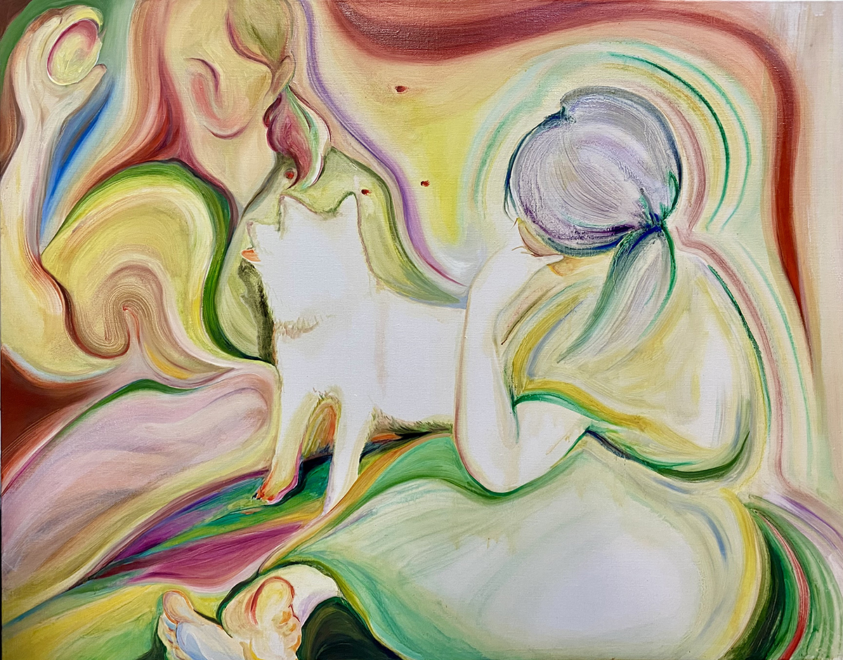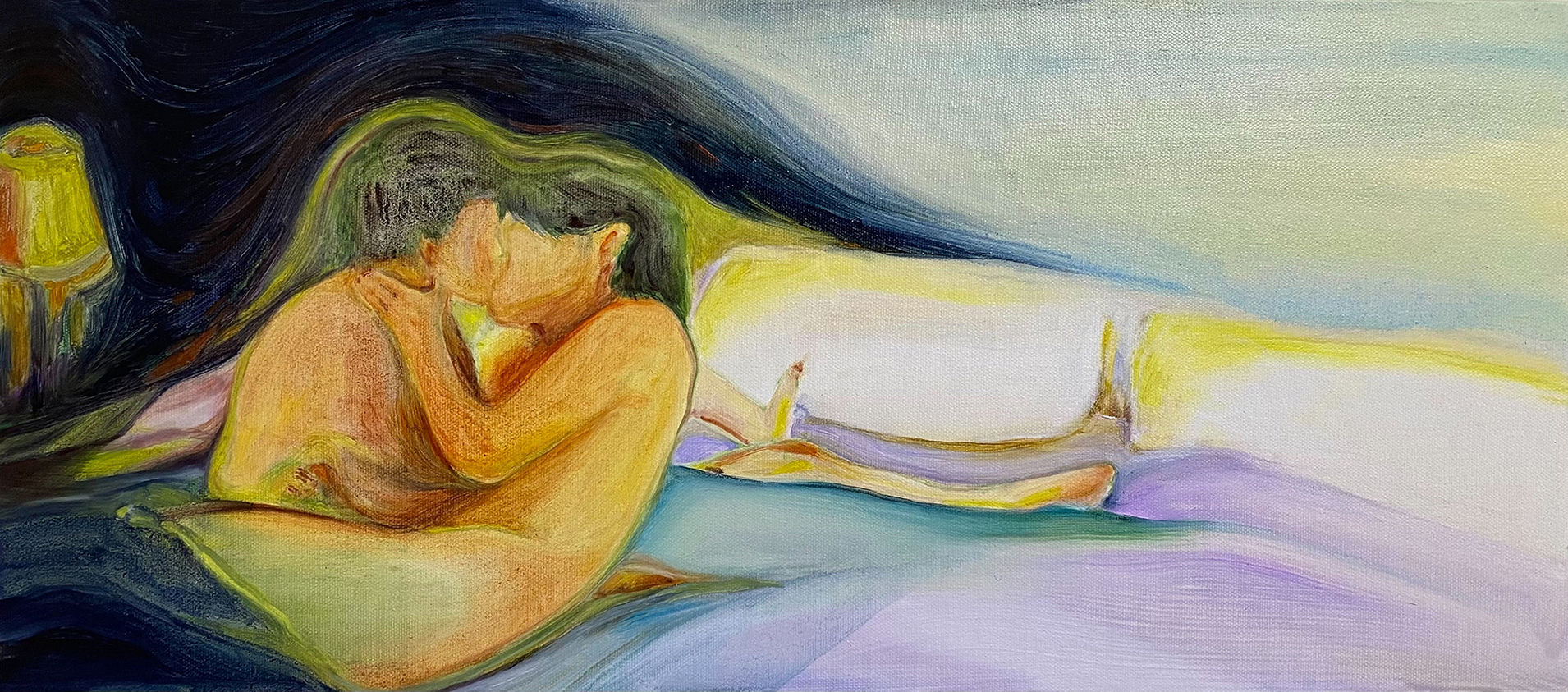 以柔和、朦朧的油彩筆觸捕捉日常生活與親密關係中的微小瞬間。她以「觸摸」作為創作起點,連結記憶中的情感對象,並透過流暢有機的線條與曖昧簡化的人物形象,營造出一種「無需犧牲的親密所在」。冷暖交錯的色彩語言如同情感間的平衡與調和,構築出既靠近又保有個體獨特性的親密動態。