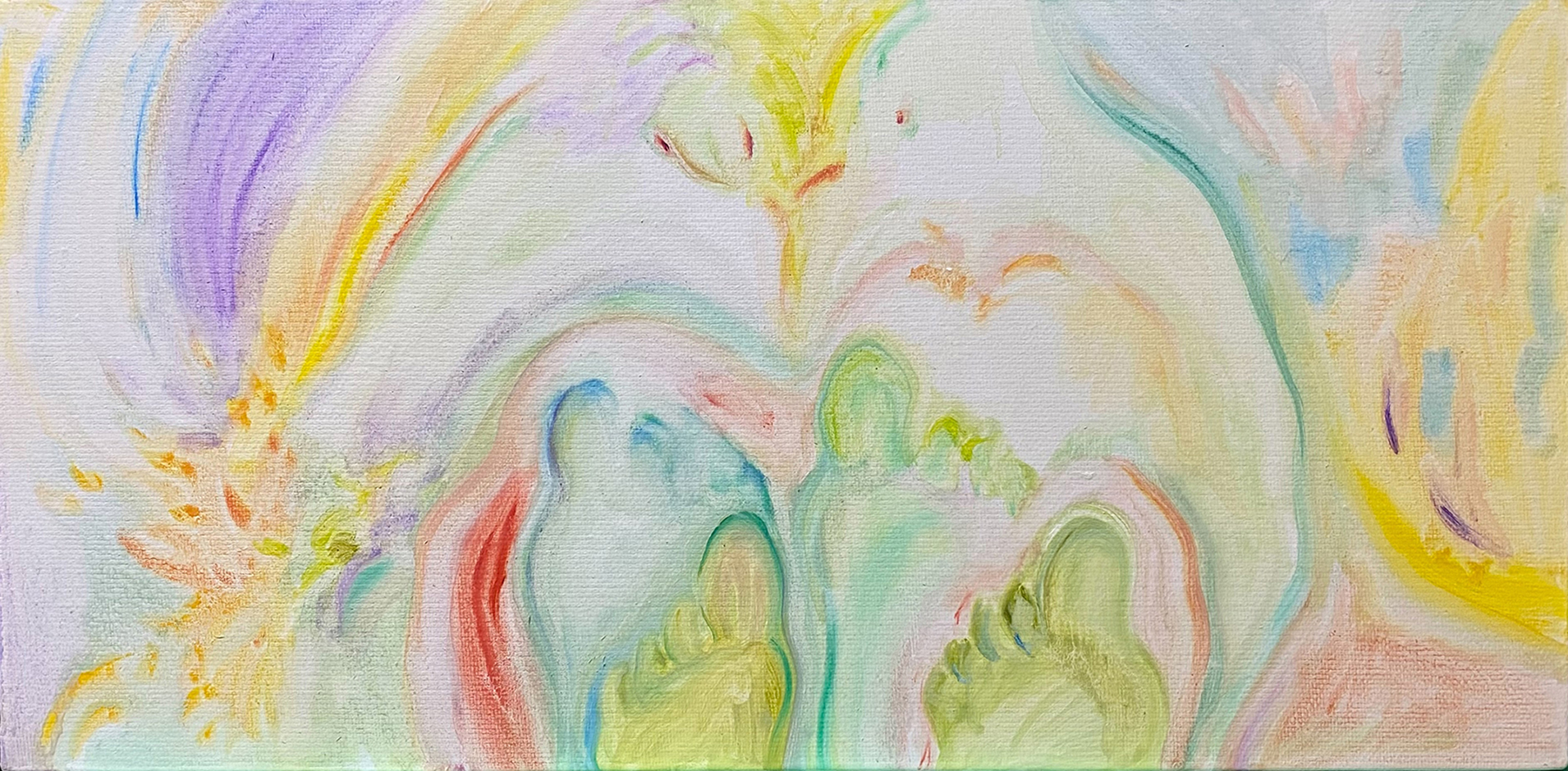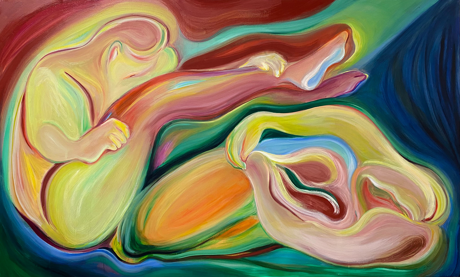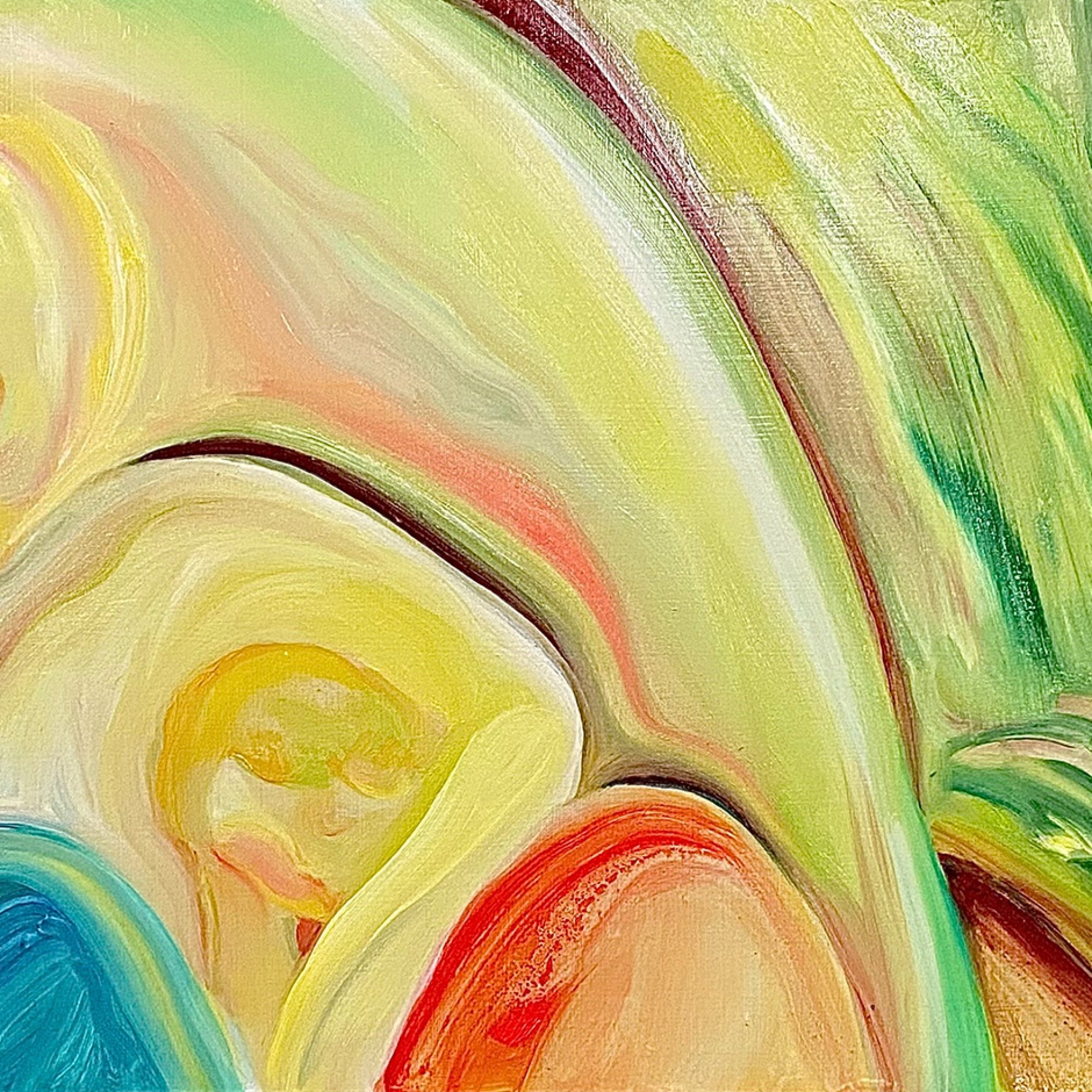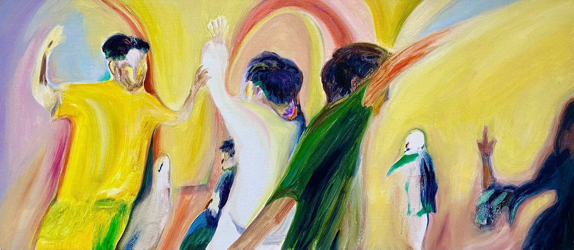 以柔和、朦朧的油彩筆觸捕捉日常生活與親密關係中的微小瞬間。她以「觸摸」作為創作起點,連結記憶中的情感對象,並透過流暢有機的線條與曖昧簡化的人物形象,營造出一種「無需犧牲的親密所在」。冷暖交錯的色彩語言如同情感間的平衡與調和,構築出既靠近又保有個體獨特性的親密動態。