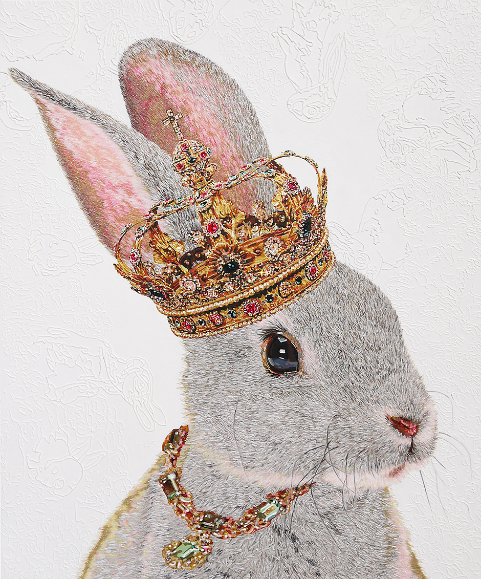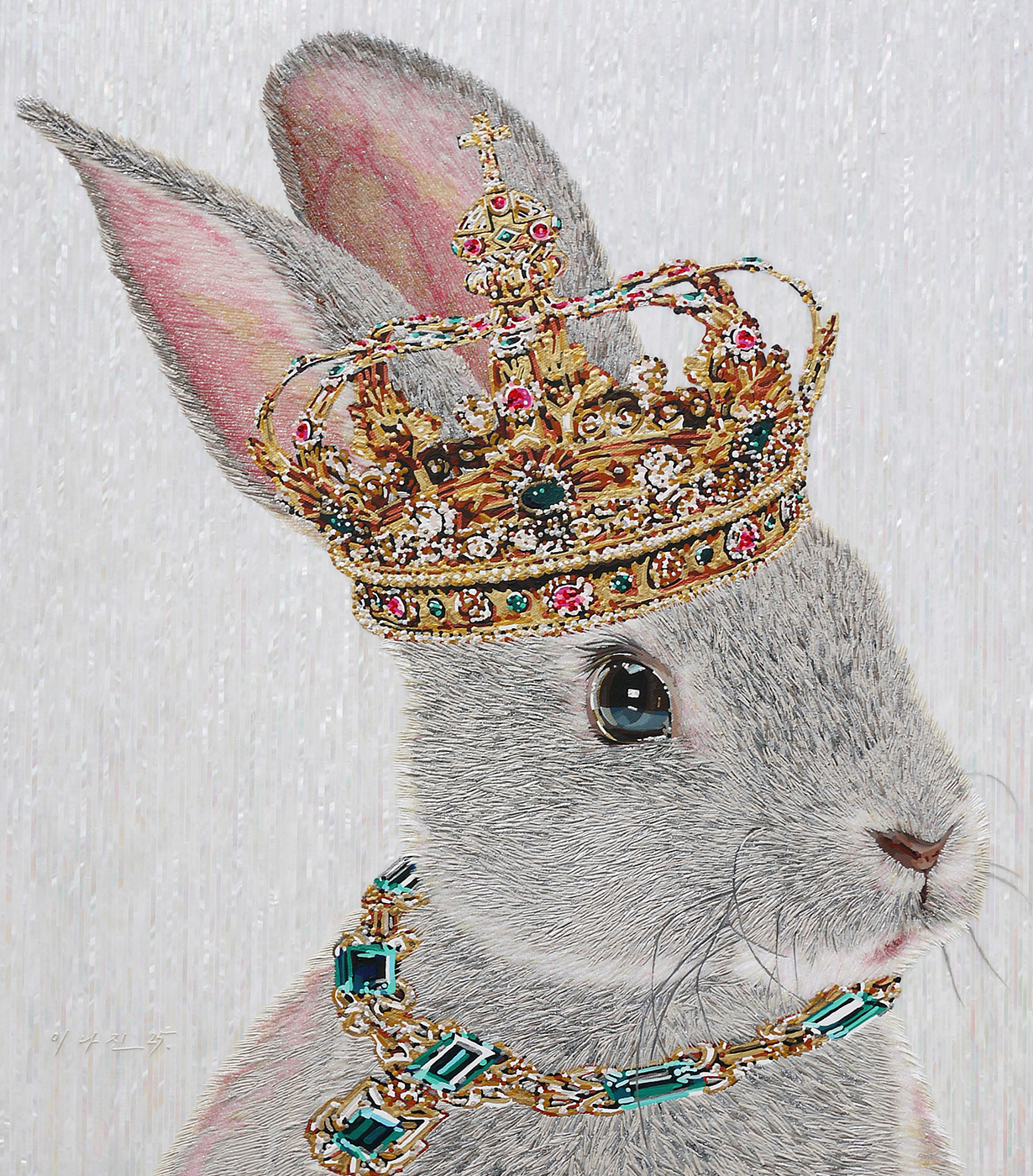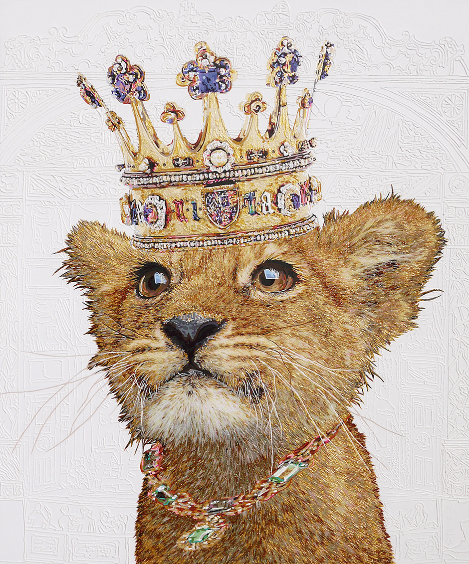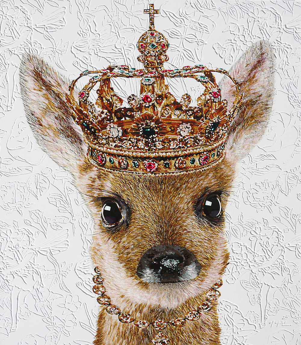 Diverse animals are shown in Lee Najin's artwork with vibrant details, lively fur, brilliant eyes, and crowns and necklaces decorated with small pieces of jewels. The tiny, shimmering sparks come alive as one approaches and admire from different angles; and can even bring the characters to life. The animal's eyes convey both confidence and curiosity. The paintings' depictions of youth animals can be interpreted as a person's childhood. Human lives consist of birth, childhood, adulthood, senior age, and death. The terror of an unknown world, unpredictability, and adult realities are similar to a journey that every person must experience at some point in their lives.