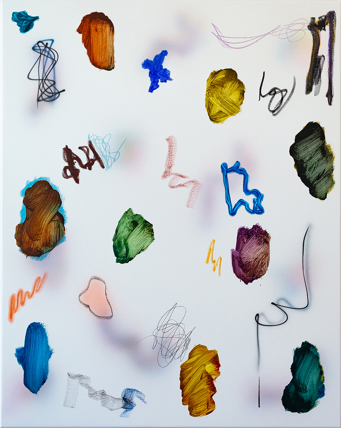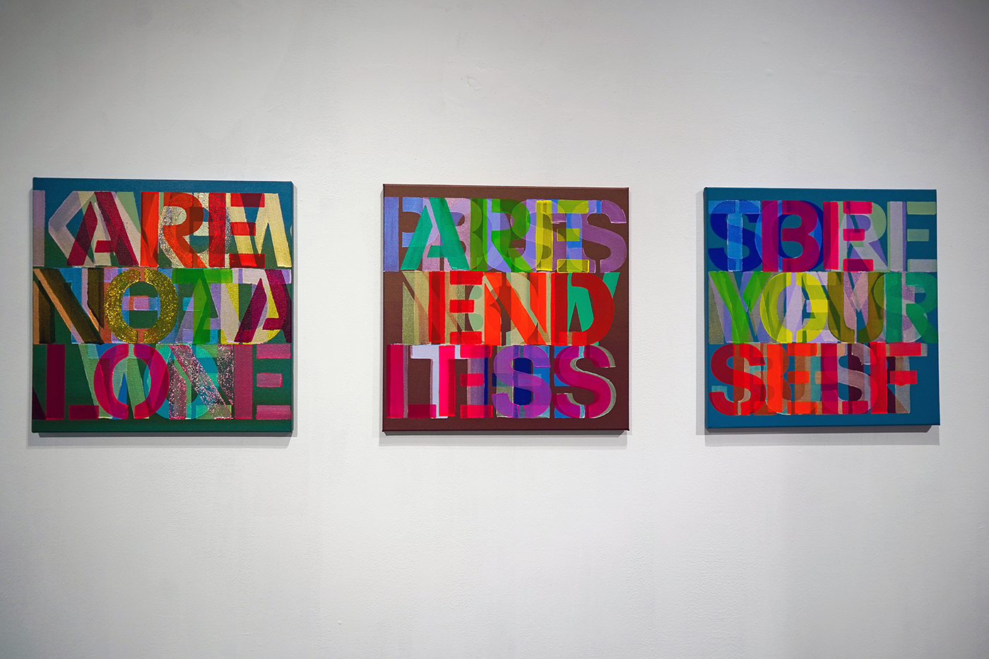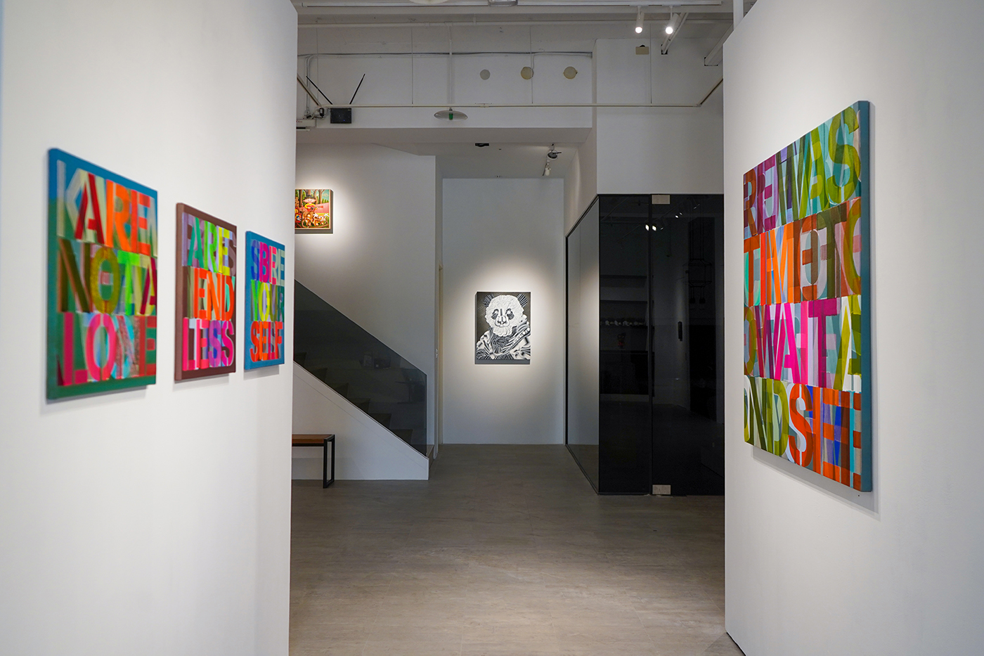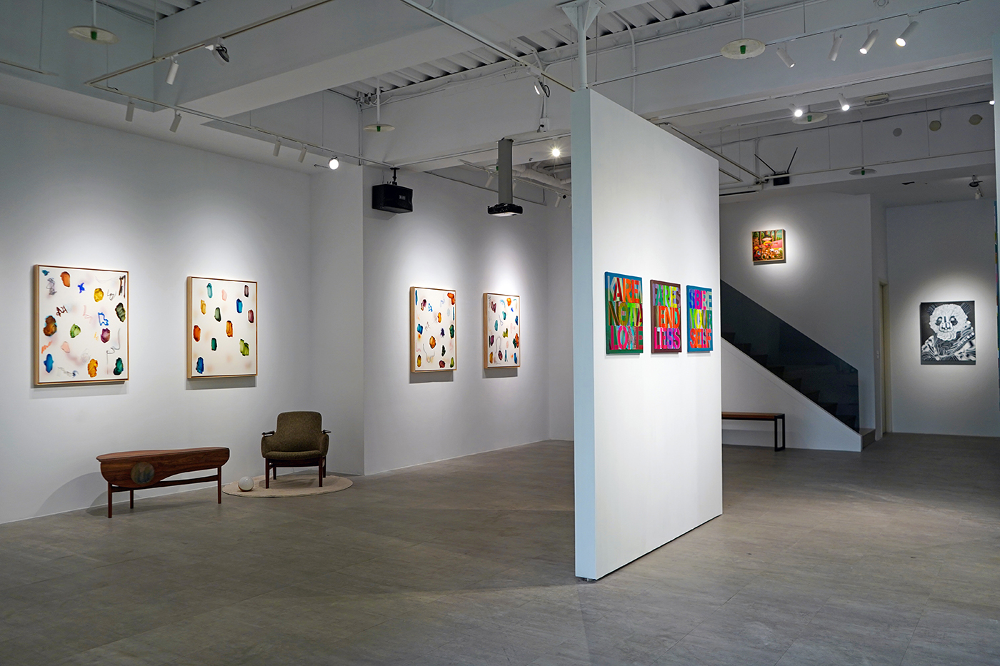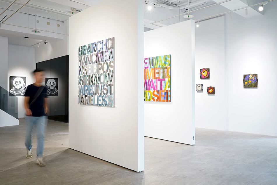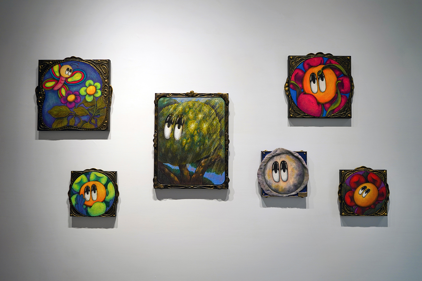 第一眼看到Niki Hare的作品,目光便不自覺地被畫面上搶眼字體與鮮亮色彩所吸引,她透過層疊交織的語句,構築出個人對存在的感知與意圖,並結合敘事文本中的時間感,流轉交織成一本耐人尋味的視覺日記;Zdenek Konvalina的抽象繪畫受到往昔舞蹈家身分的薰染與連結,創作過程依循身體與潛意識的即時反饋,藉各式細膩而不張揚的色彩及筆觸來探索物質與精神之間的比例關係,調和出藝術家內心的獨特圖景;Geoffrey Bouillot單色系列創作受東西文化的深刻影響,現居日本的他,作品除了挪用日本動漫元素,同時融合義大利未來主義、立體派和普普藝術的構成形式,將動漫角色幻化成不易直觀辨識的形態,藉此尋求新的互動關係。清晰線條和光影蘊造金屬般質感,搭建出風格獨具的奇想世界;智敉譽(Jimere)以生活周遭那些不識其名的花草樹木或石頭作為描繪對象,用以指涉生態與社會中無數缺乏重視或身份認同的邊緣群體,藝術家慎重地為它們製作精美的框,期許觀賞者能保持開闊的心態,與天地萬物建立愛的連結與交流。