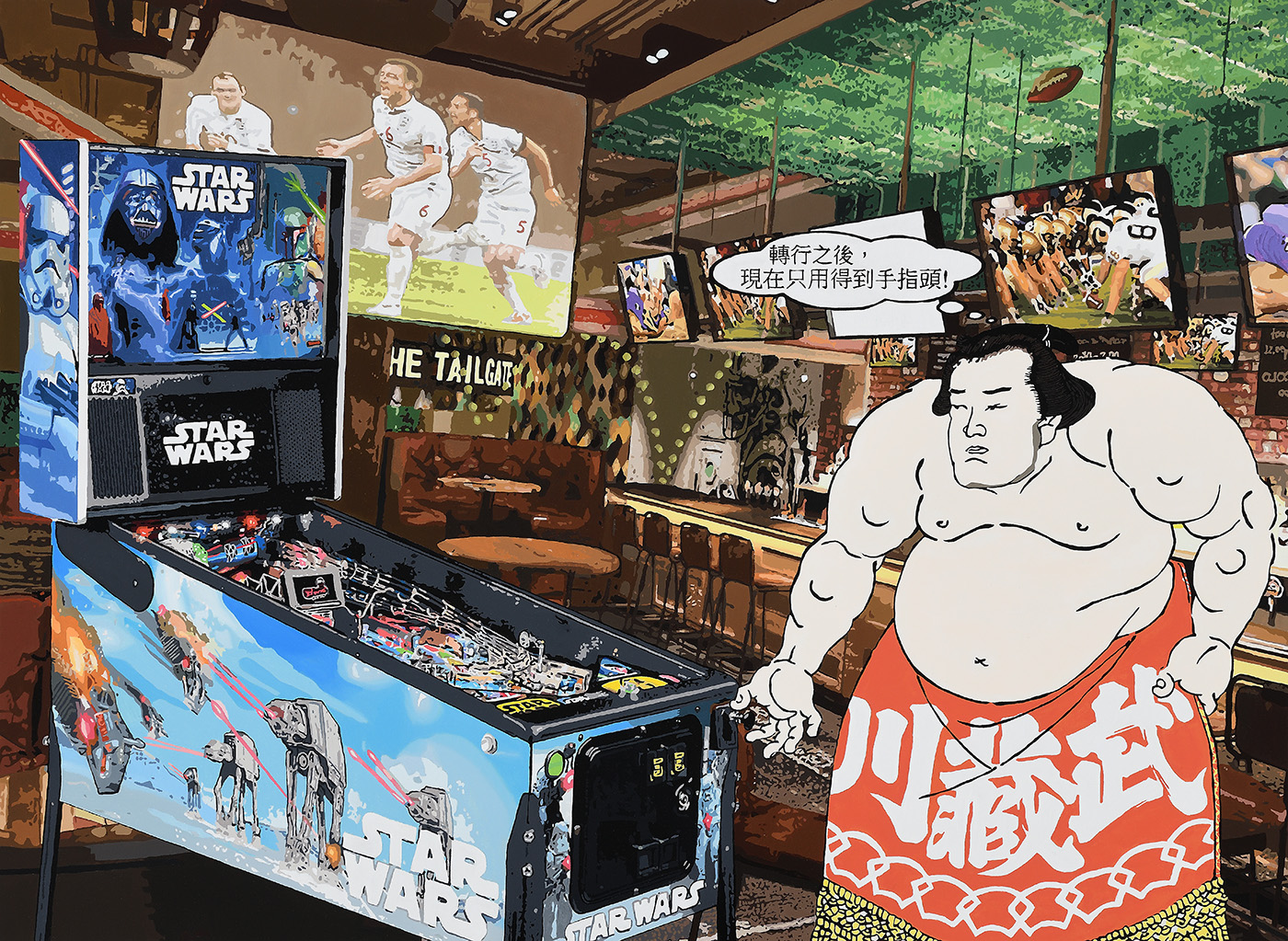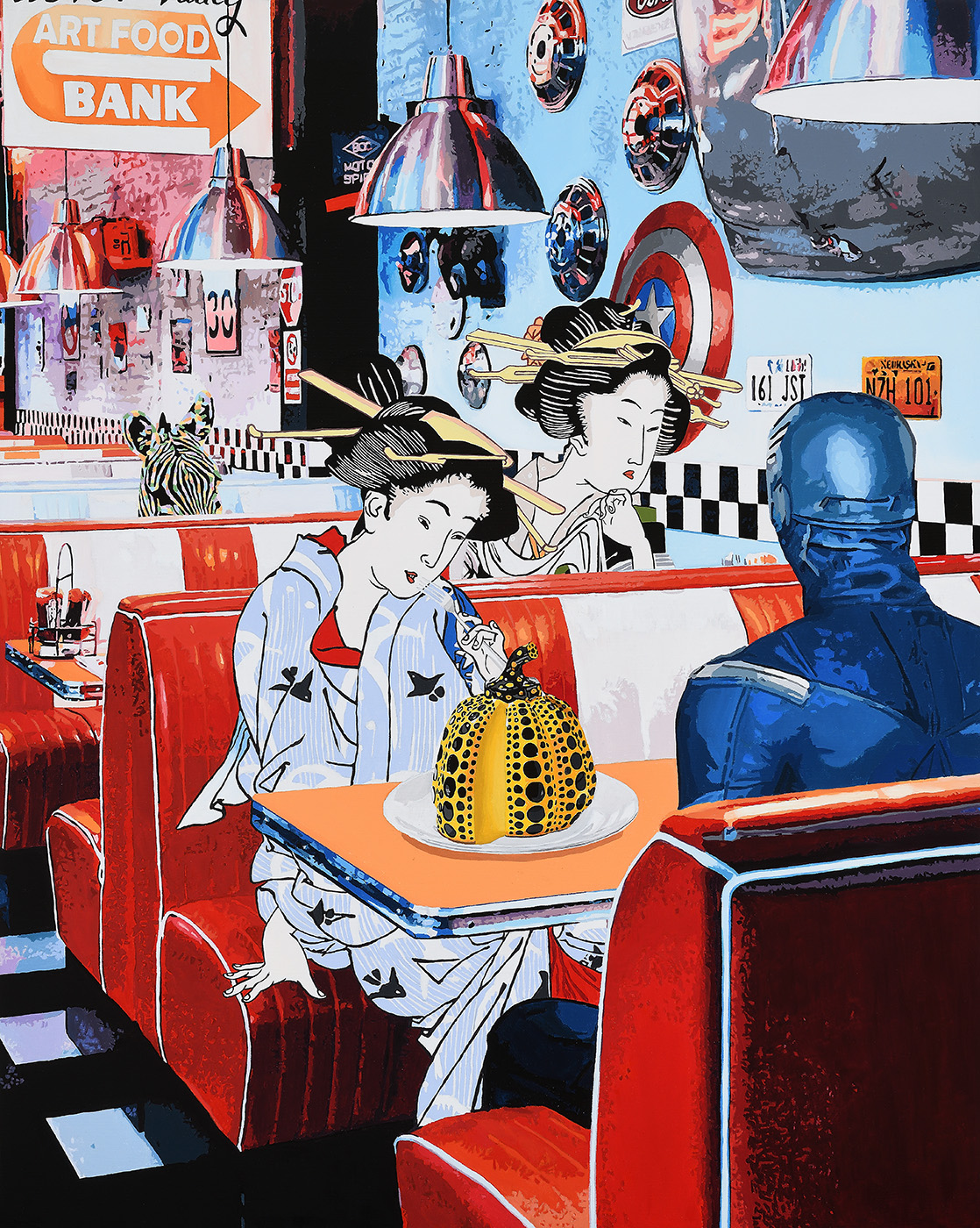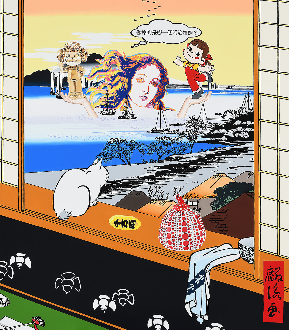 昔日的世界經歲月沖刷最終歸於無形,得以留存的便成為人類重要思想依據,在全球化趨勢下,隨著多元資訊的快速流動,思想主軸、社會結構及文化價值已然產生質與量上轉變。身處一個藝術與議題緊密聯動的當代藝術世界,黃麟詠的「文化嬉遊」表達符號翻玩帶給人們新的美學與問題反思,時而諷刺、荒謬、時而卻浪漫、幽默,搭建出屬於我們當今時代的「浮世繪」,詼諧訴說時間長河搬挪下信仰與價值觀的改變。