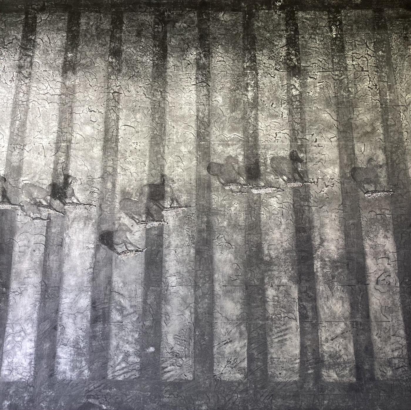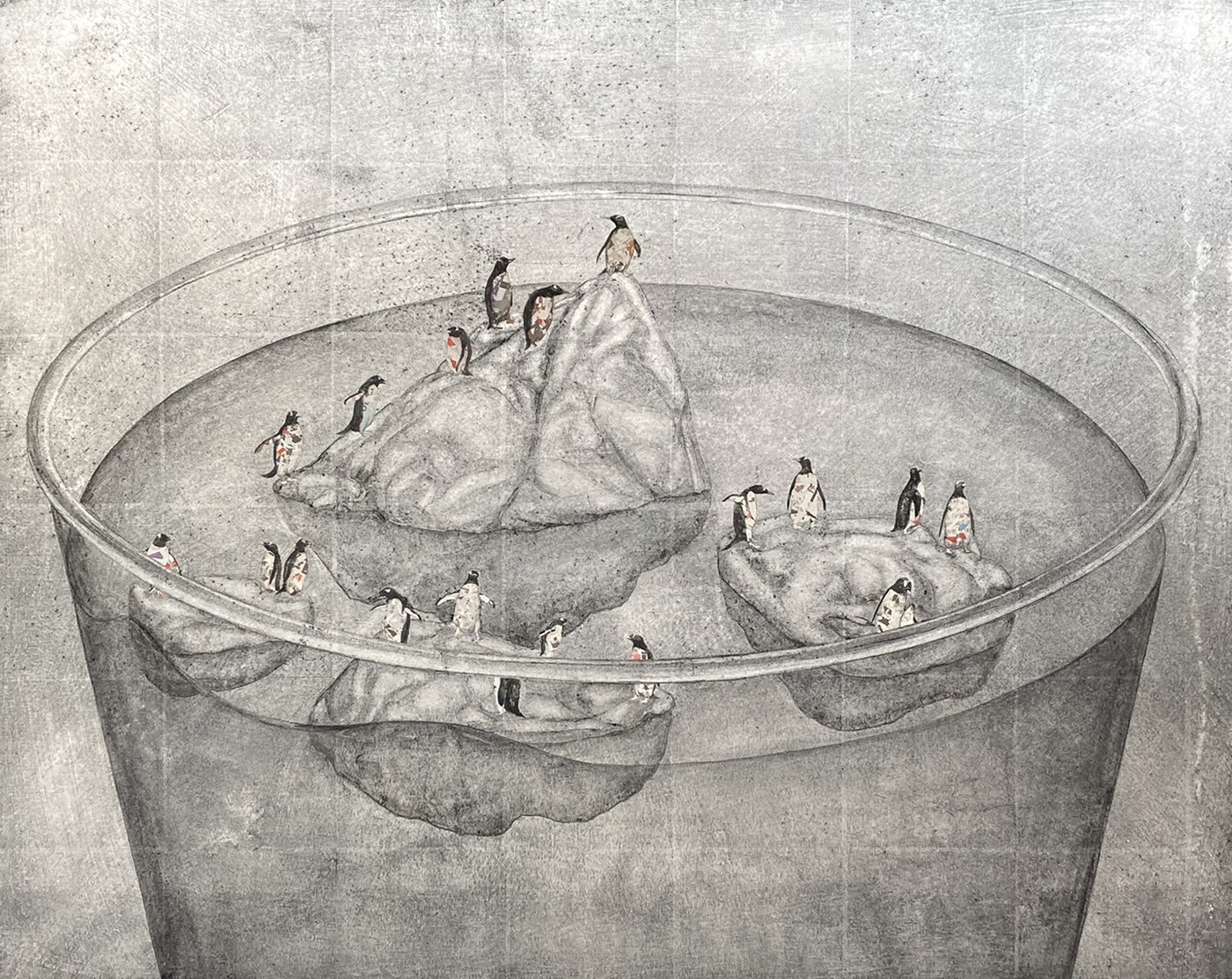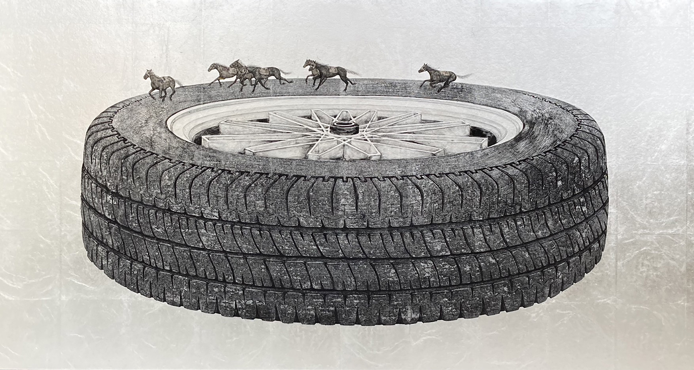New works of Hakuta Yoshuya extend the collection“Black and White”which released last year. The animal figures gradually become clearer from rich dark pigment, presenting a subtle profound grace and mysterious playfulness. This time, he also combines animal behavior with familiar artifacts in life, responding to the impact of social conditions on the animals’situation. In the new 2023 work “Derby”, the racing horses keep running on the tread, but no matter how fast they are, they cannot compete with the horse power of the car engine. In the past, the horse was an indispensable tool for human transportation and farming. However, it has become a symbol of recreational culture. “Antarctic Sea” shows the gradual reduction of the ice in the glass, Reminding people that as the sea level rises rapidly, the Antarctic penguins are experiencing a harsh living environment. In today’s world where Animal Ethics are increasingly valued, Yoshuya also leads the viewers to focus on and reflect on the symbiotic relationship between humans and nature.