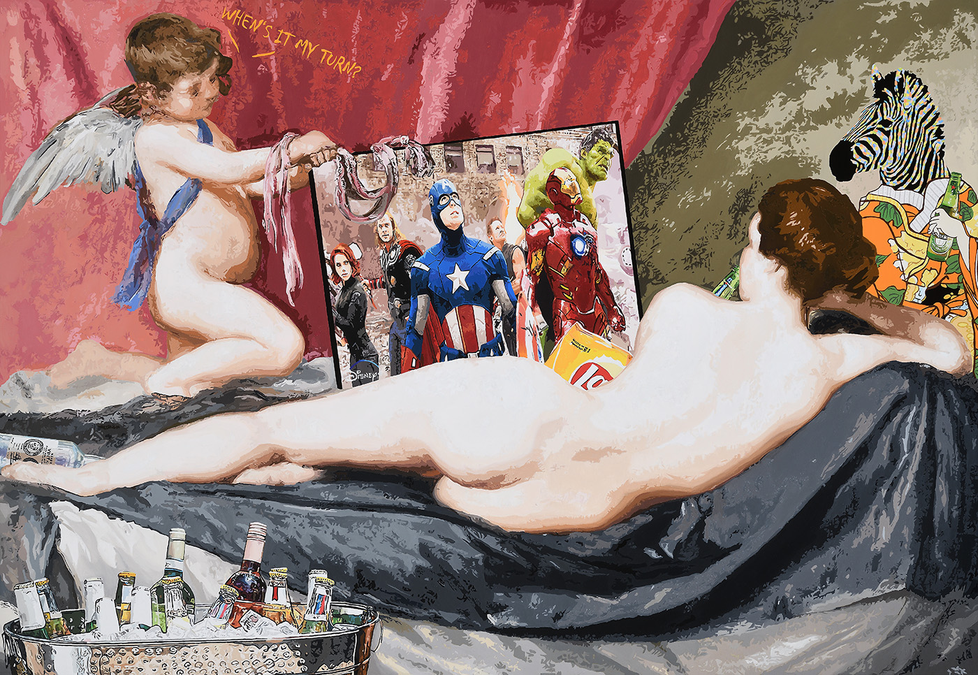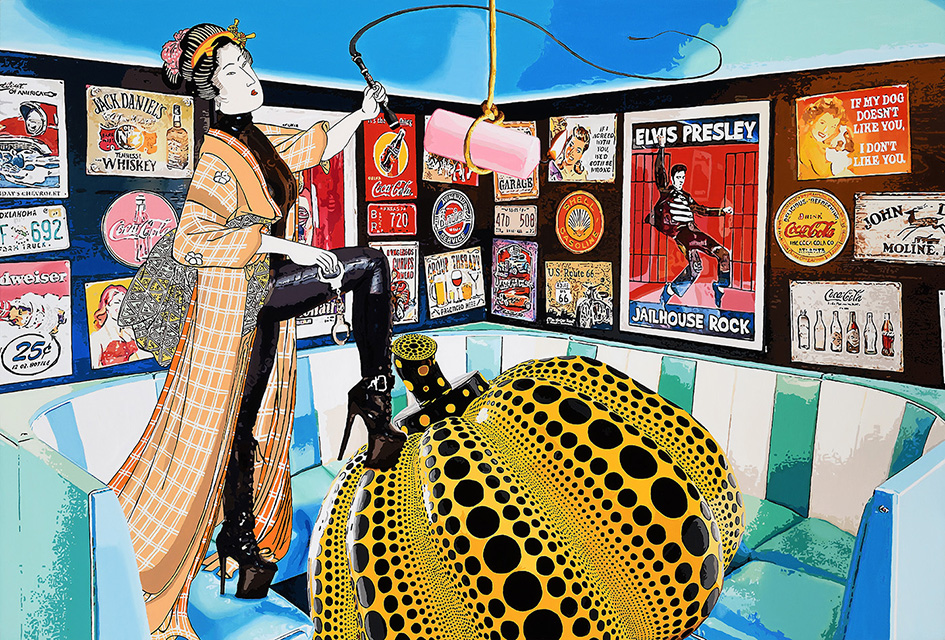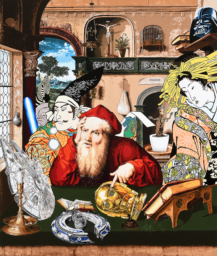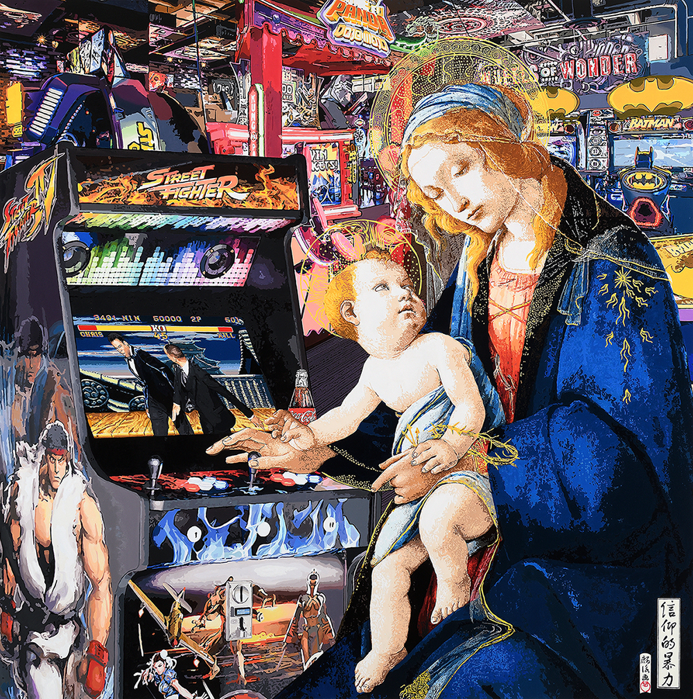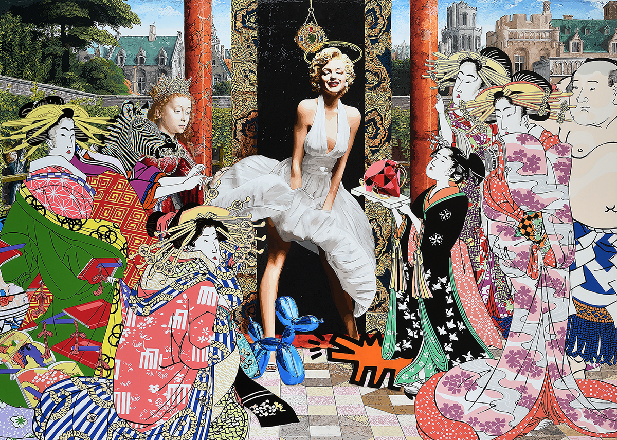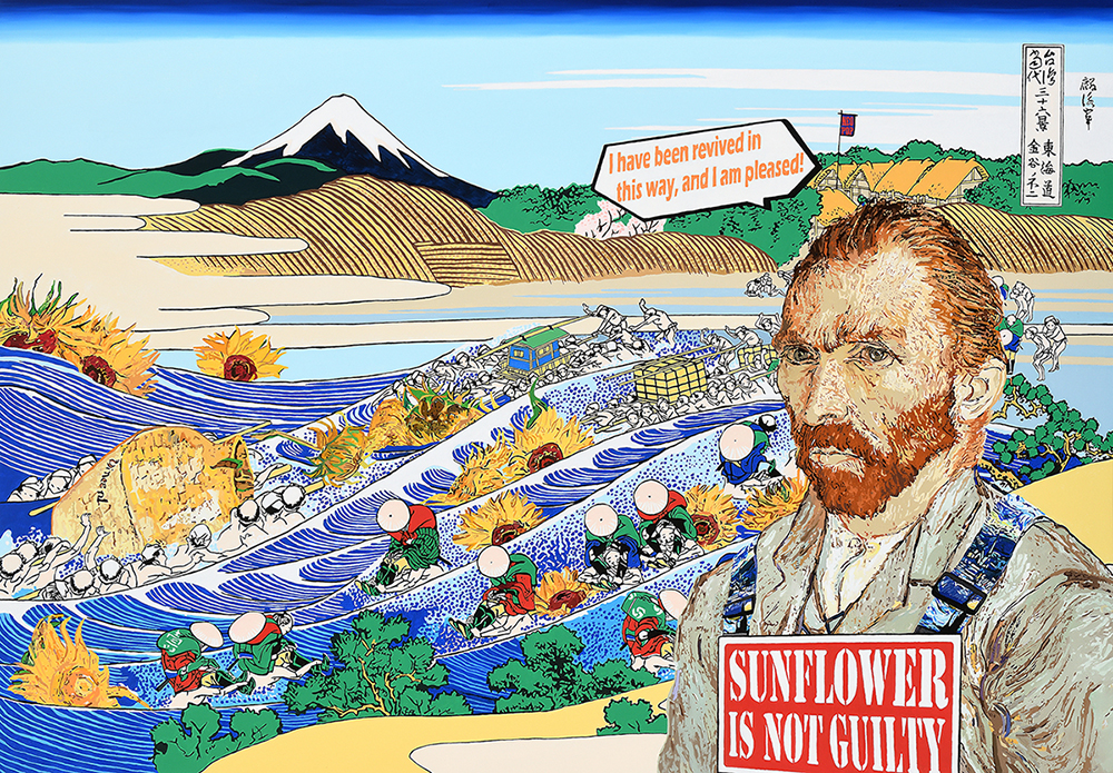 Reflecting on the digital age in which humanity is living, Huang’s new works take a perspective close to Ukiyo-e, transcending ancient and modern masterpieces from the East and West. Also, Huang flexibly using everyday reality and news events to present her profound observations in facing huge artistic traditions and contemporary life. Through the excellent paintings techniques and the theatrical atmosphere of the composition, and the placement of multiple cultural symbols, the viewers are invited to think about the attractions and changes between different cultures. It builds a “floating world” at our presence and speaks humorously the changes in beliefs and values as time moves on.