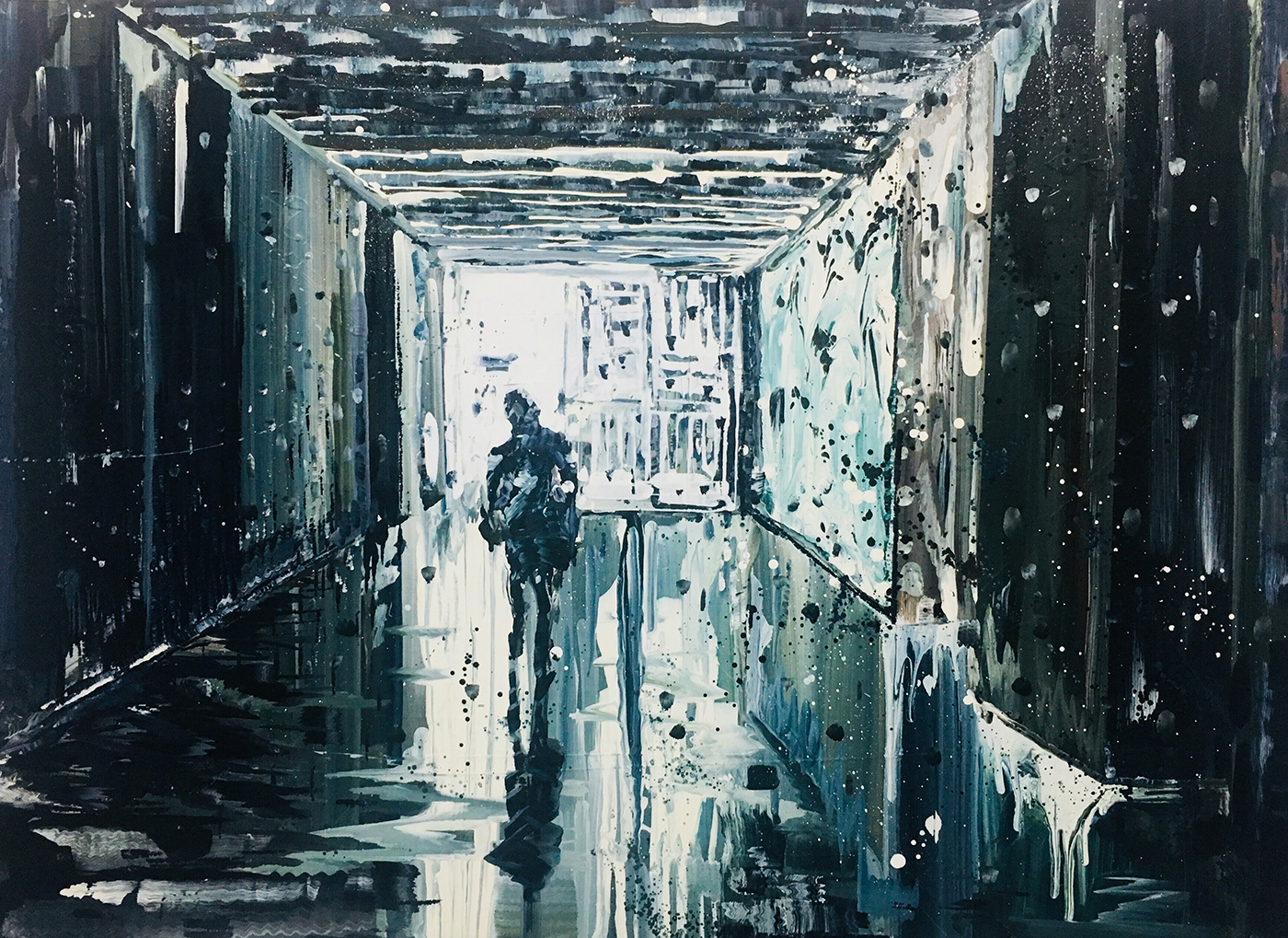 創作以日常生活做為連結,運用隨手捻來的影像進行挪移、擴大延伸,構築出真實且虛幻的景緻。在畫面構成上,他利用大量低彩度油彩,造就時間推移感的流動痕跡,並透過顏料的反覆堆疊、剔除,將片刻壓縮在同畫面上,猶如逆光一般的輪廓在殘影重疊下,帶出隱隱作弄的疏離感和不安定性。壓縮過後的場域,喻示現今影像資訊的社會對映下四處漫遊的幽魂主角,呈現出生活光景擷取菁華片段的快速暫留感,充滿了當下性,亦表現出年輕人快速、蠻不在乎的獨特思考方式與城市氛圍,藉以探討影像對於新世代族群的影響,並喚起觀者最親切的生命體驗。