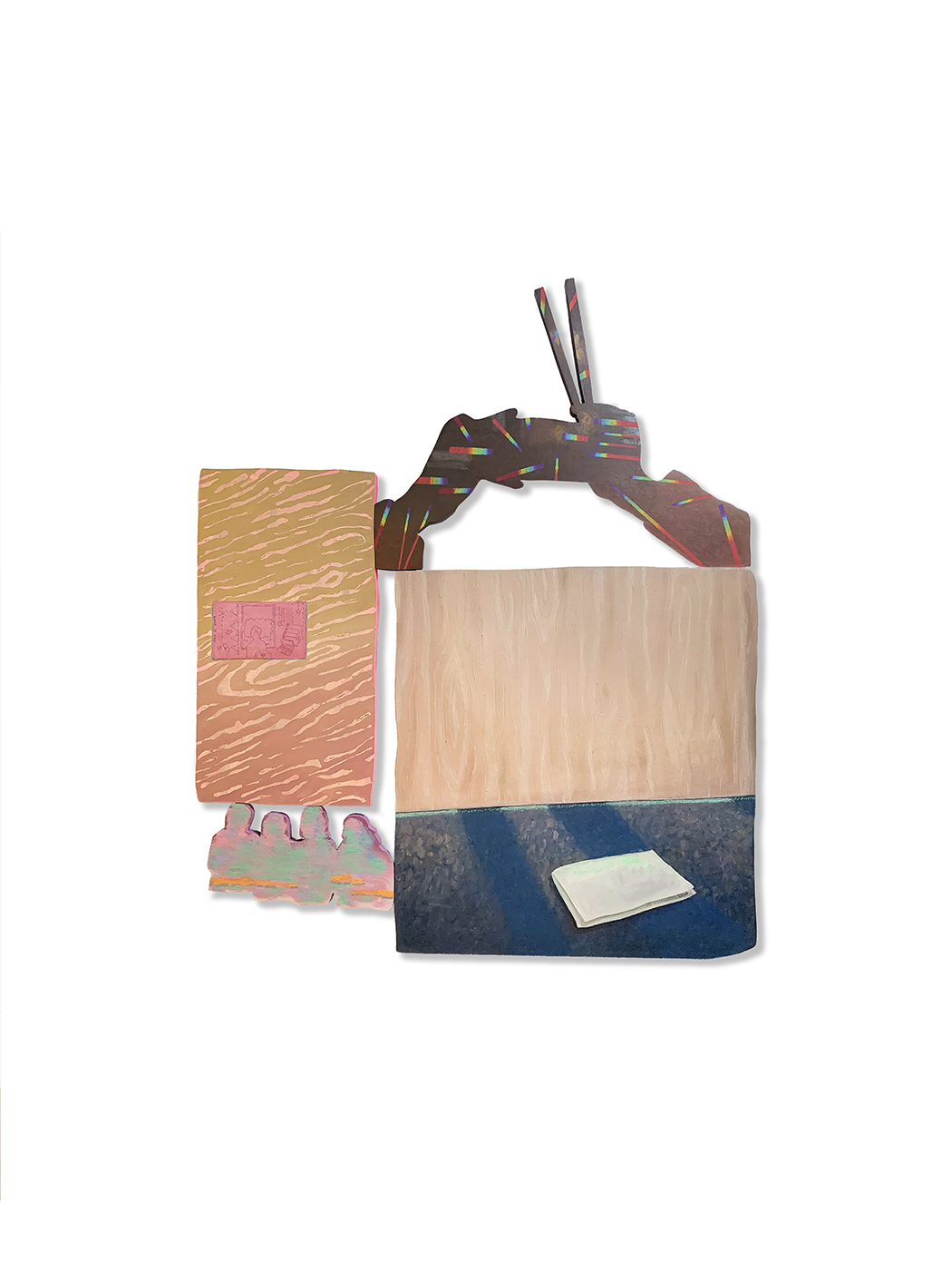 For Fournier, self-exploration is a lifelong task that is reflected in her work. The fluttering, pastel colors make up the base of her life, the fragmented memories are collaged and layered in the image, and the soft lines depict the uncertainty during self-exploration. In the past two years, Fournier has shifted to using irregular wooden boards, which become metaphors for her changing identity through the dents and rearrangements of the material, allowing the restless mind to reach a state of fulfillment. The artist hopes that viewers can be reminded of the existential meaning of these ordinary objects, and as time goes by, the traces of everyday life that have accompanied us in different stages of life will become sanctuaries in each of our hearts.
