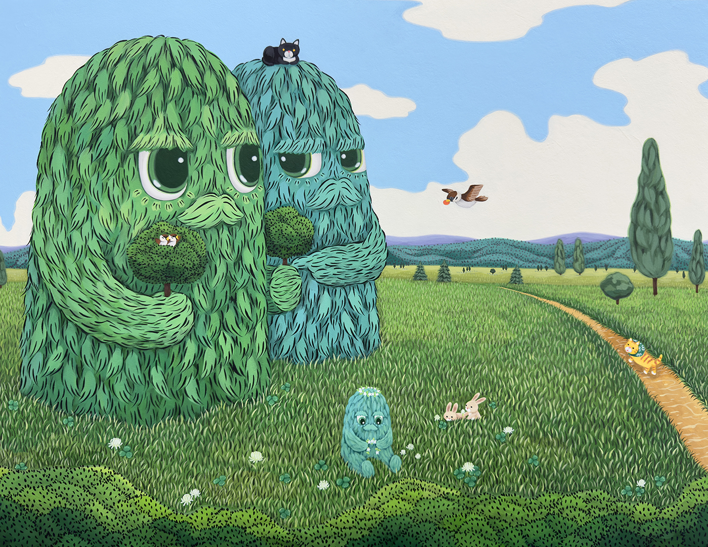 李素乙:「我希望那些被人們遺忘的動物們,無論牠們是身處於森林或是城市裡的,都能在我的畫中獲得圓滿結局。」,根基於對動物保育議題的啟迪,並結合古代神話的綺想,李素乙的作品展現出一個獨特且魔幻的世界觀,在她的架空國度裡,「Mimyohae」被視為守護森林的山神,以此為發端,牽引出無數迷人物語。