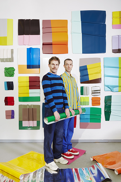 ROTTEVEEL VERMEER荷蘭藝術雙人組,是由Jochem Rotteveel 與Thomas Vermeer 於2021年組合,以對色彩的共同熱情展開創作。兩人分別來自當代藝術與時尚領域,卻自然地在創作中交匯,以乙烯箔片(塑膠箔片)作為媒材,在鋁塑複合板上創作——融合繪畫與雕塑的特性,挑戰色彩、材質與空間的界限。其創作手法在平面上加入摺疊與體積,探索二維與三維的交界;無法實體混色的材質,則透過光線與觀者的視覺經驗達成光學混色。他們的牆面創作為展覽場域量身打造,展期結束即拆除,質疑藝術是否需要永恆存在,轉而強調觀看當下的瞬間價值。