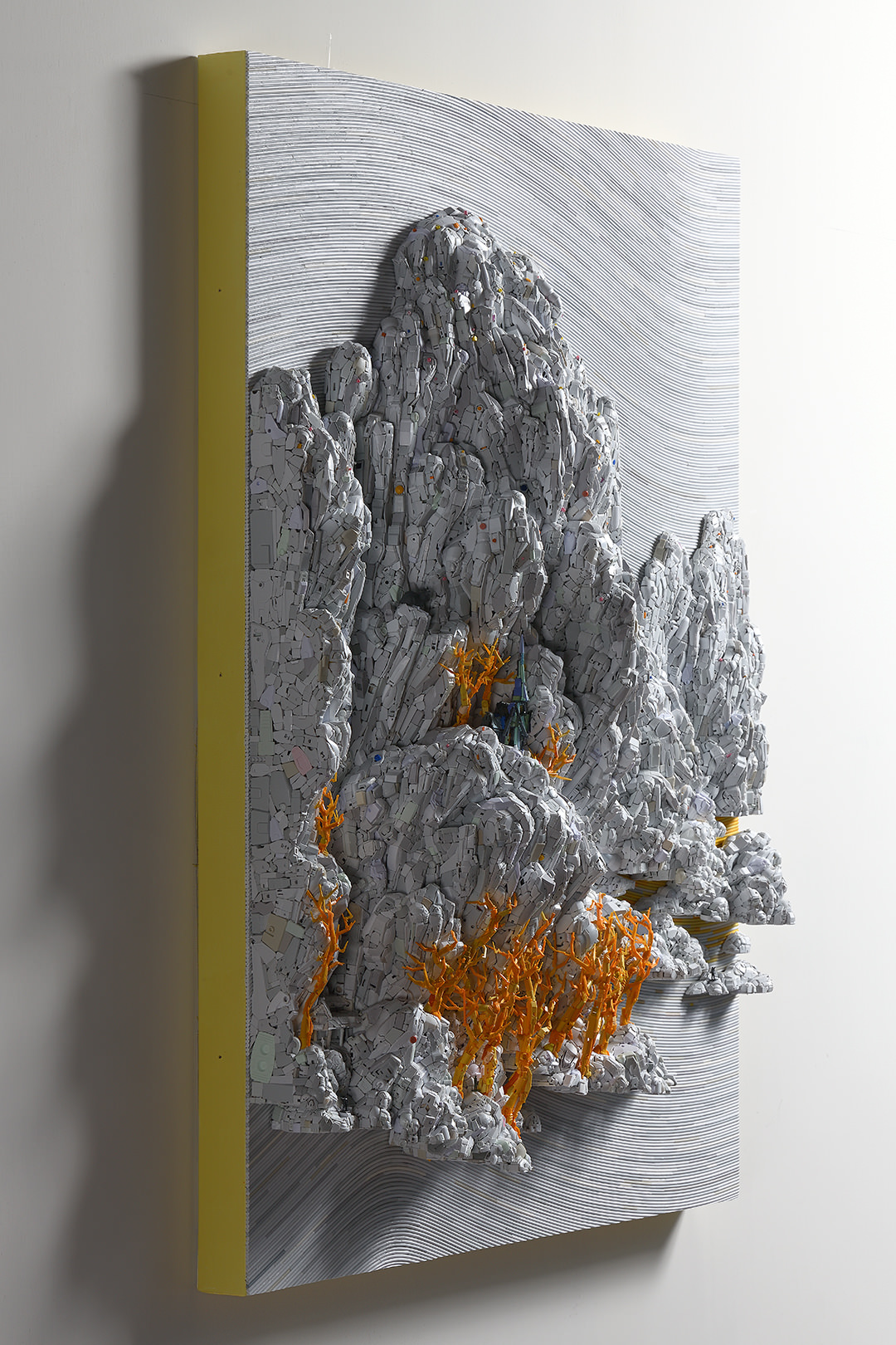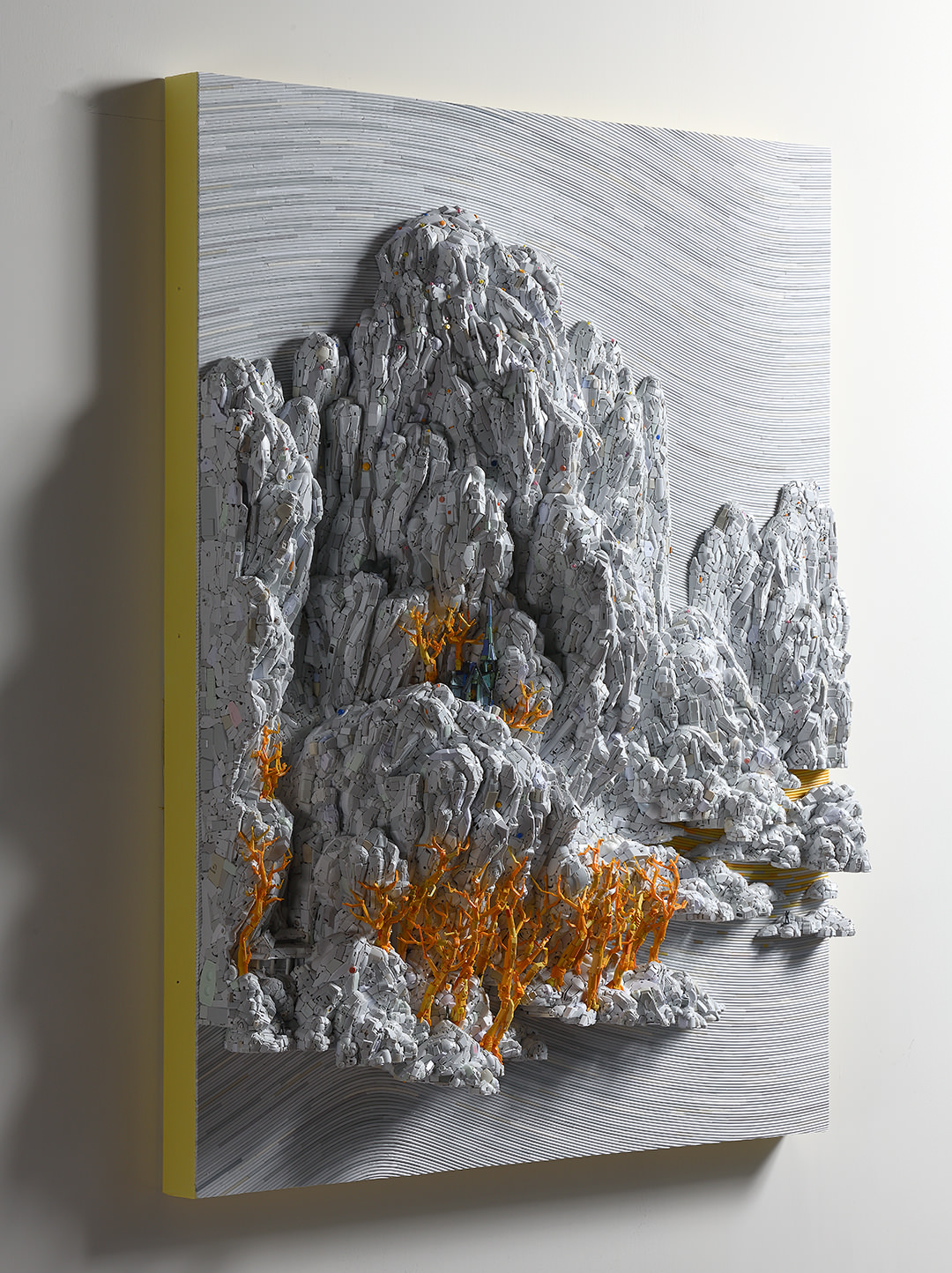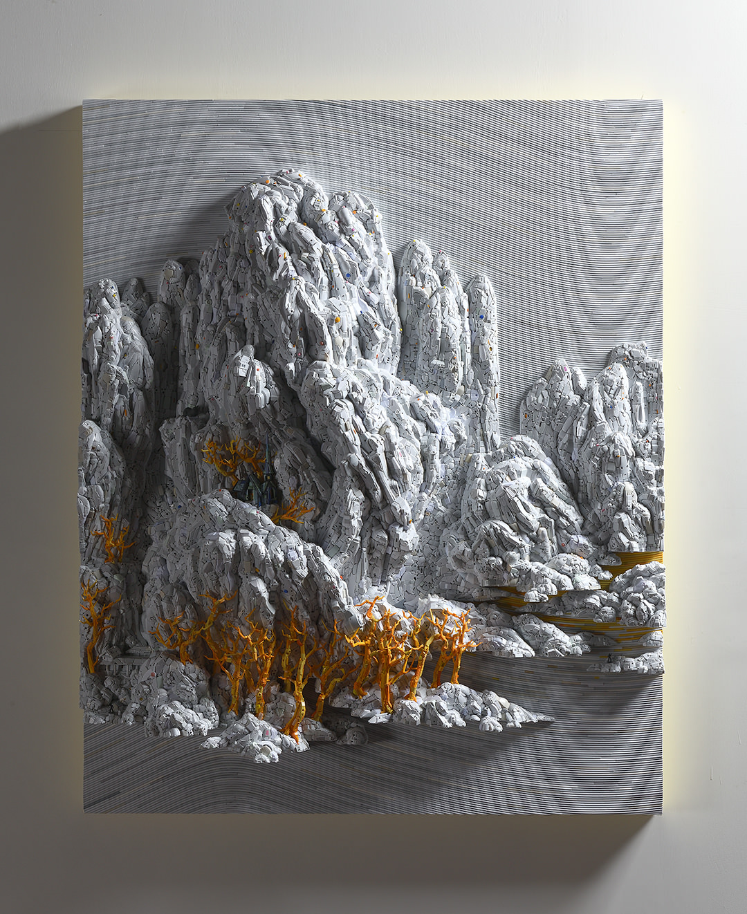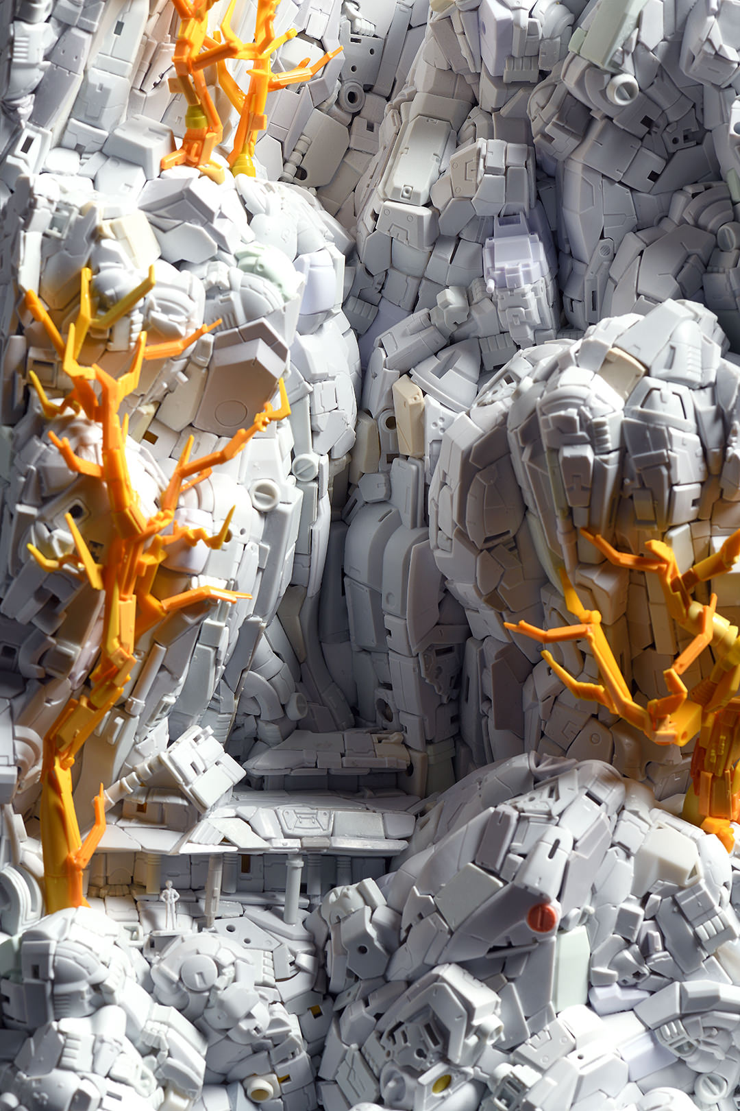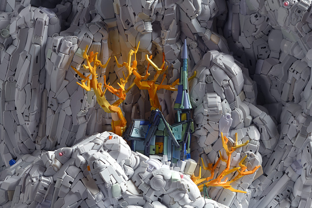 〈海裡的雪景寒林與他的梵谷動物園〉中,他援用范寬經典名作〈雪景寒林圖〉,整體皆使用鋼彈模型零件進行主體架構及內部填充,關中山林雪後的景象透過立體形塑轉化顯得更加氣象磅礴,而半山腰上原有的廟宇被藝術家巧妙置換成文森・梵谷(Vincent van Gogh)筆下的〈奧維爾教堂〉(The Church at Auvers),古今中外在此匯聚交流。藝術家希冀用一種符號裂解與本質易位的方式,以兩種消費社會的符號互相碰撞,使他作品的材料語言,能夠透過素材內在指涉的文本批判,進行解構再建構的可能,延續其藝術話語。