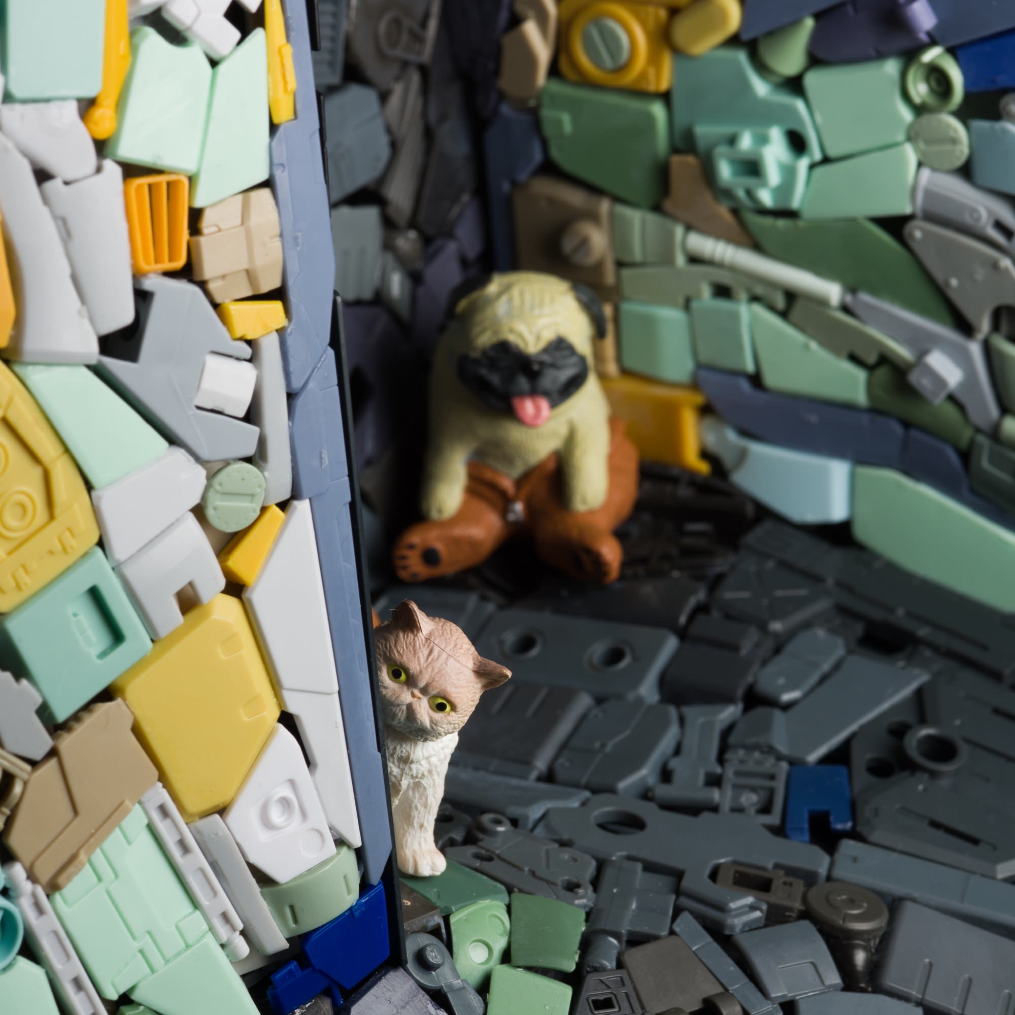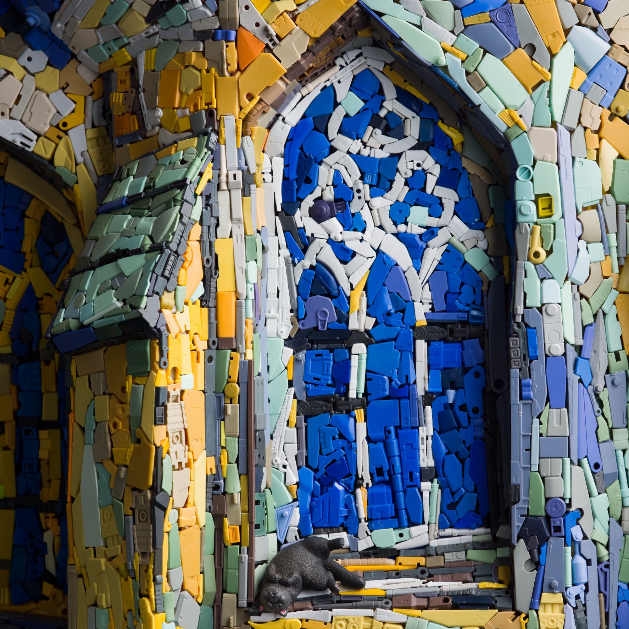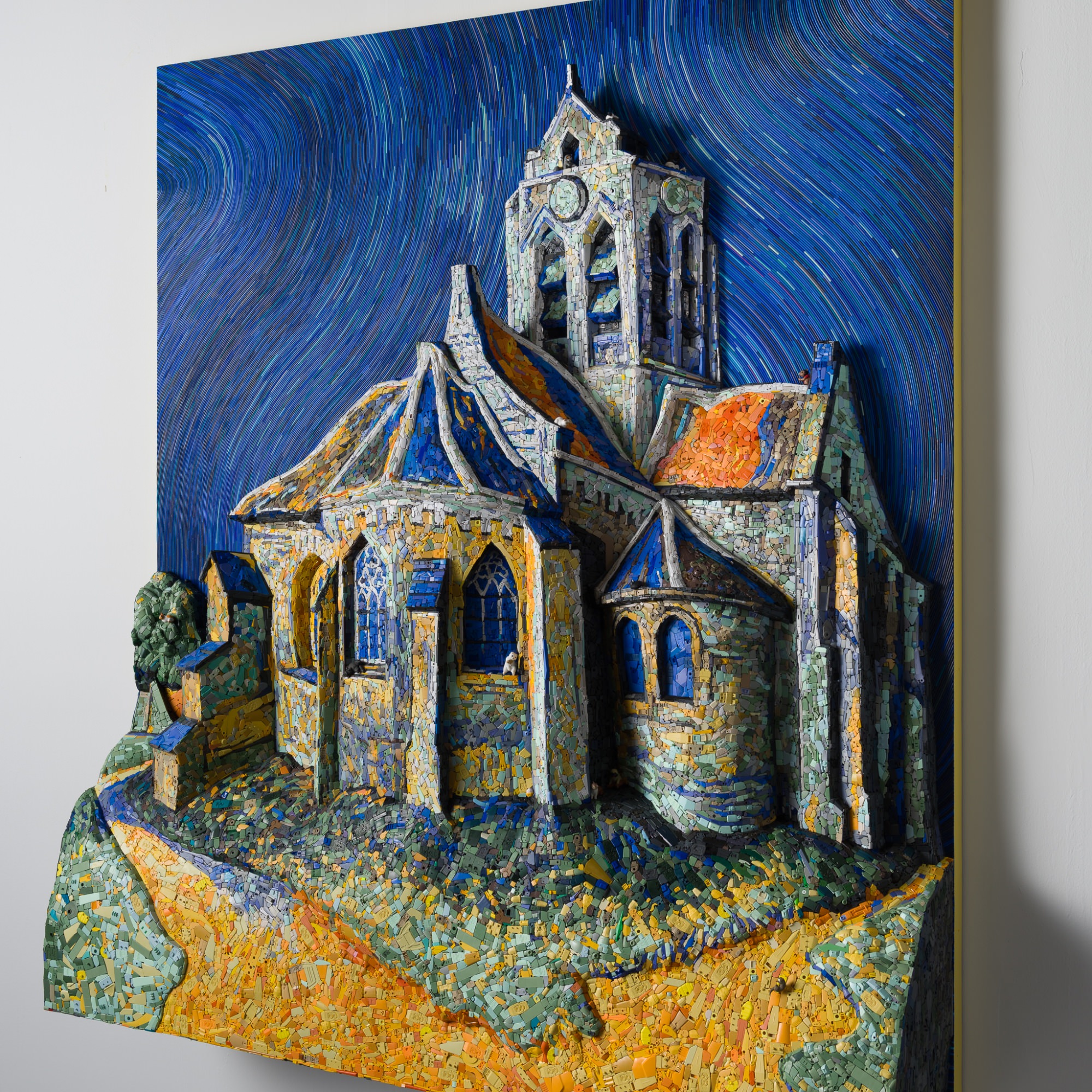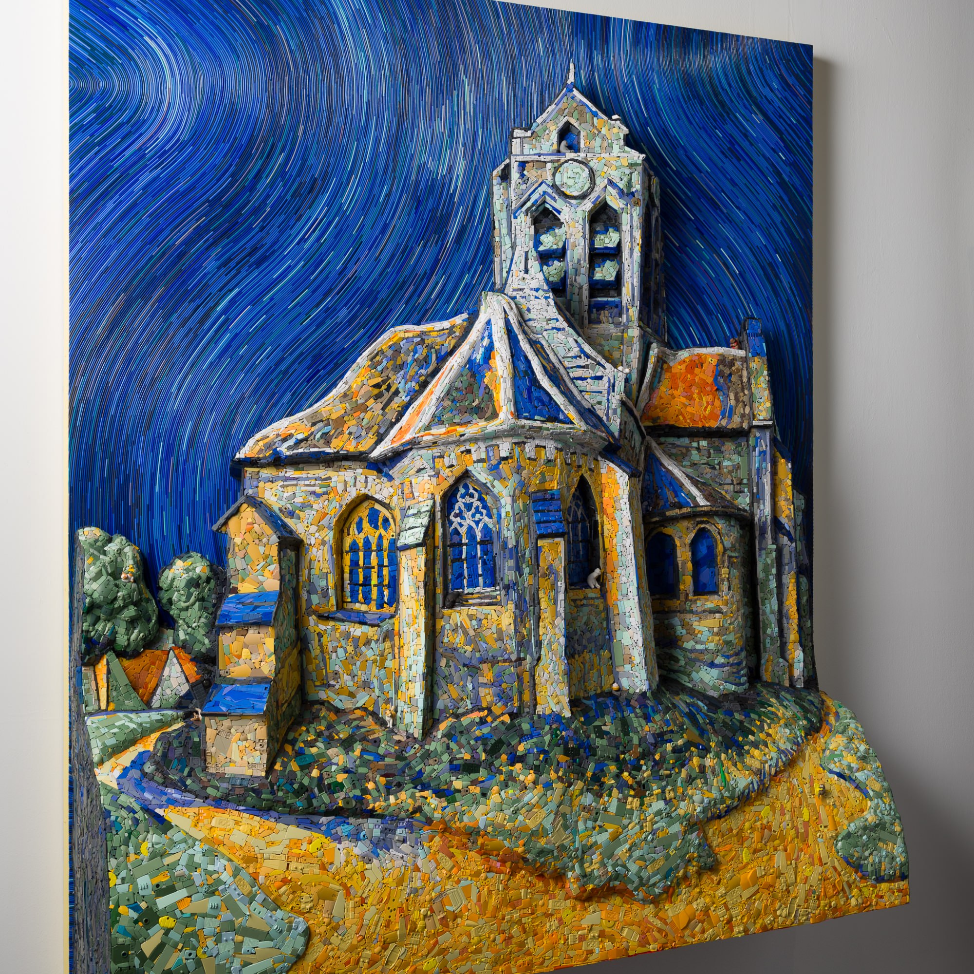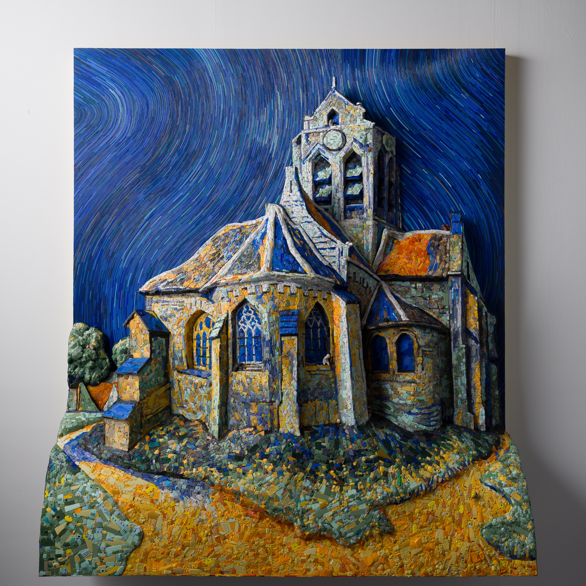 梵谷的《奧維的教堂》(The Church at Auver)對大眾而言是一個符號,鋼彈也是一個符號,林俊彬以符號為材料再現一個符號,並加入扭蛋的動物玩具,代表著以動物形象縮小的「物件」,在教堂場景中遊歷世界的情境……從視角的轉換,林俊彬透過作品表達主體雖不表現,但透過生產活動、組織的模式暗示出來。表達梵谷雖然很偉大,但在平行世界的我們也同樣是非凡的。