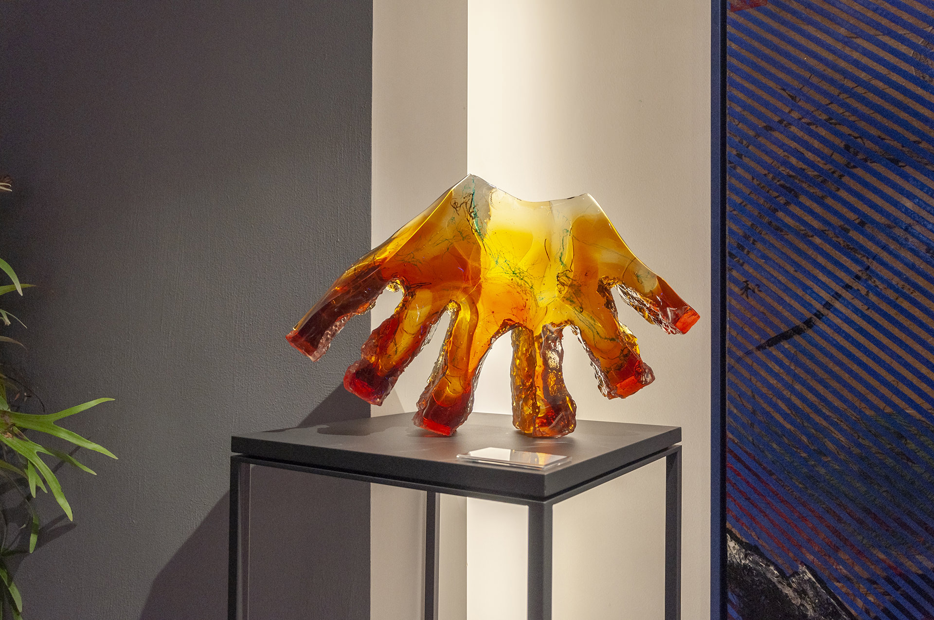 ▌藝術家簡介 許文龍,1991 年自臺灣藝術大學雕塑系畢業後,期間參與及執行多件公共景觀雕塑案,直至2000年起前往中國進行玻璃研究及考古修復工作,2012年返台後致力於玻璃雕塑創作,前後取得台灣清華大學藝術與設計學系碩士與北京清華大學設計學博士學位,現任教於台灣清華大學藝術與設計學系。專注於玻璃藝術已超過二十年的他,以國內少見的「窯鑄技法」建立獨特風格,其細膩的表現技法賦予玻璃別緻的造型與無限的色彩,作品的寫意造型語彙結合了主觀意識與客觀物象,傳達著他心眼所見的獨特世界。