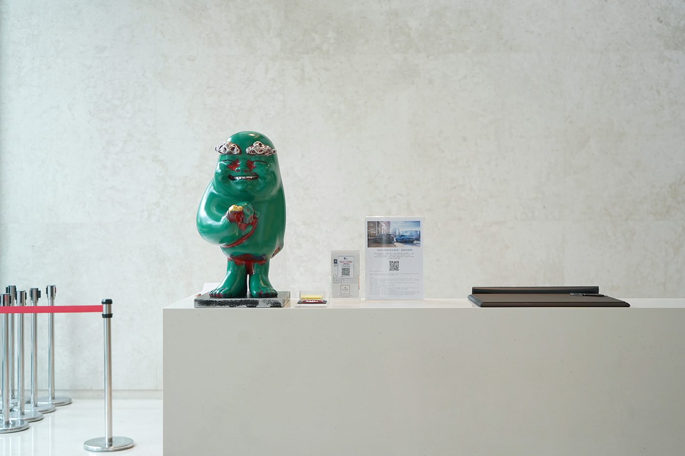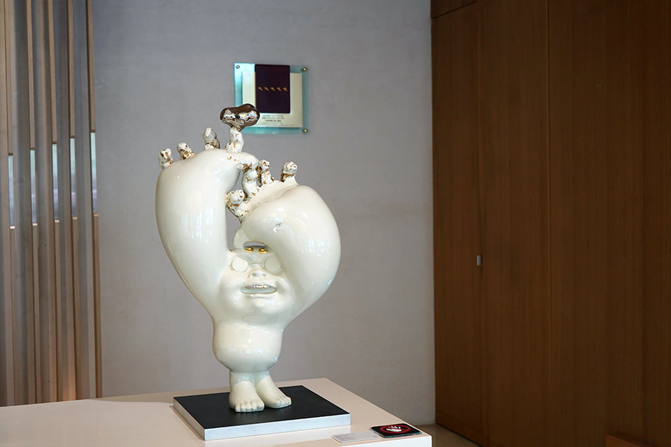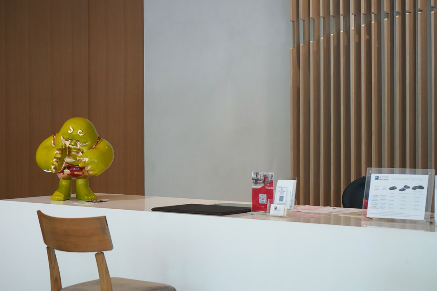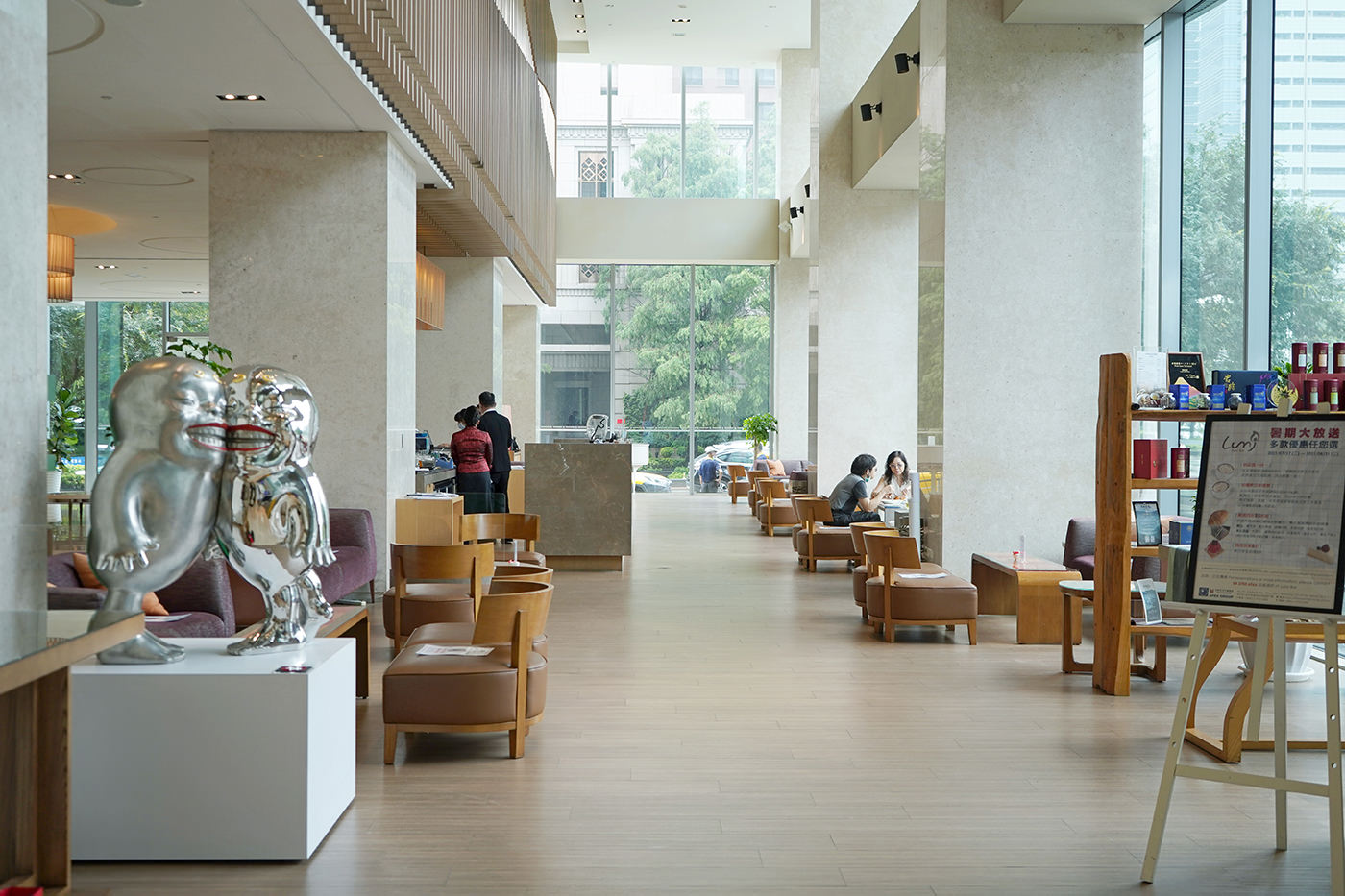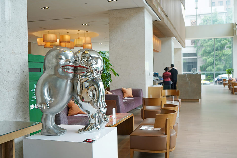 佇立於大廳中央處的兩米巨作〈金好〉元氣滿滿地望向來往人潮,以紅金配色散發熱情活力,燦爛笑顏不禁令人感染到快樂氣息;輾轉來到櫃檯處,則可見〈有神〉及〈共好〉分坐兩頭以燦爛笑容迎接報到的旅人;準備搭車出遊時,在諮詢台上可見聚精會神猜拳比劃的〈鬥士〉,傳達人在世上的分秒皆處於抉擇狀態,並慢慢造就每個獨特的生命及故事,透過酒店提供的諮詢服務,期盼引領旅人做出最好的出遊選擇;返家前不妨同親朋好友相約旅覓酒吧,與緊貼雙頰的〈好好〉見證每段心心相惜的珍貴情誼!