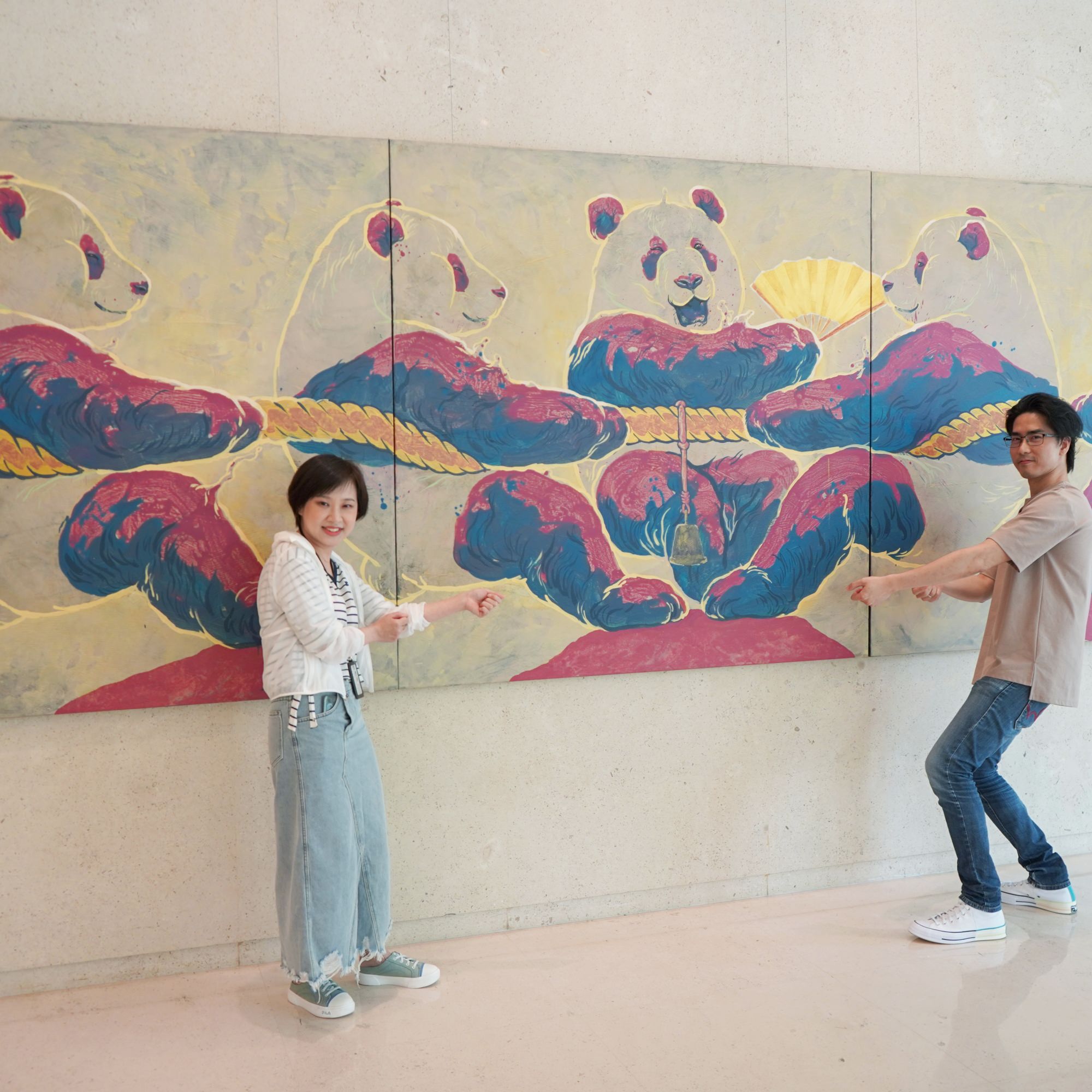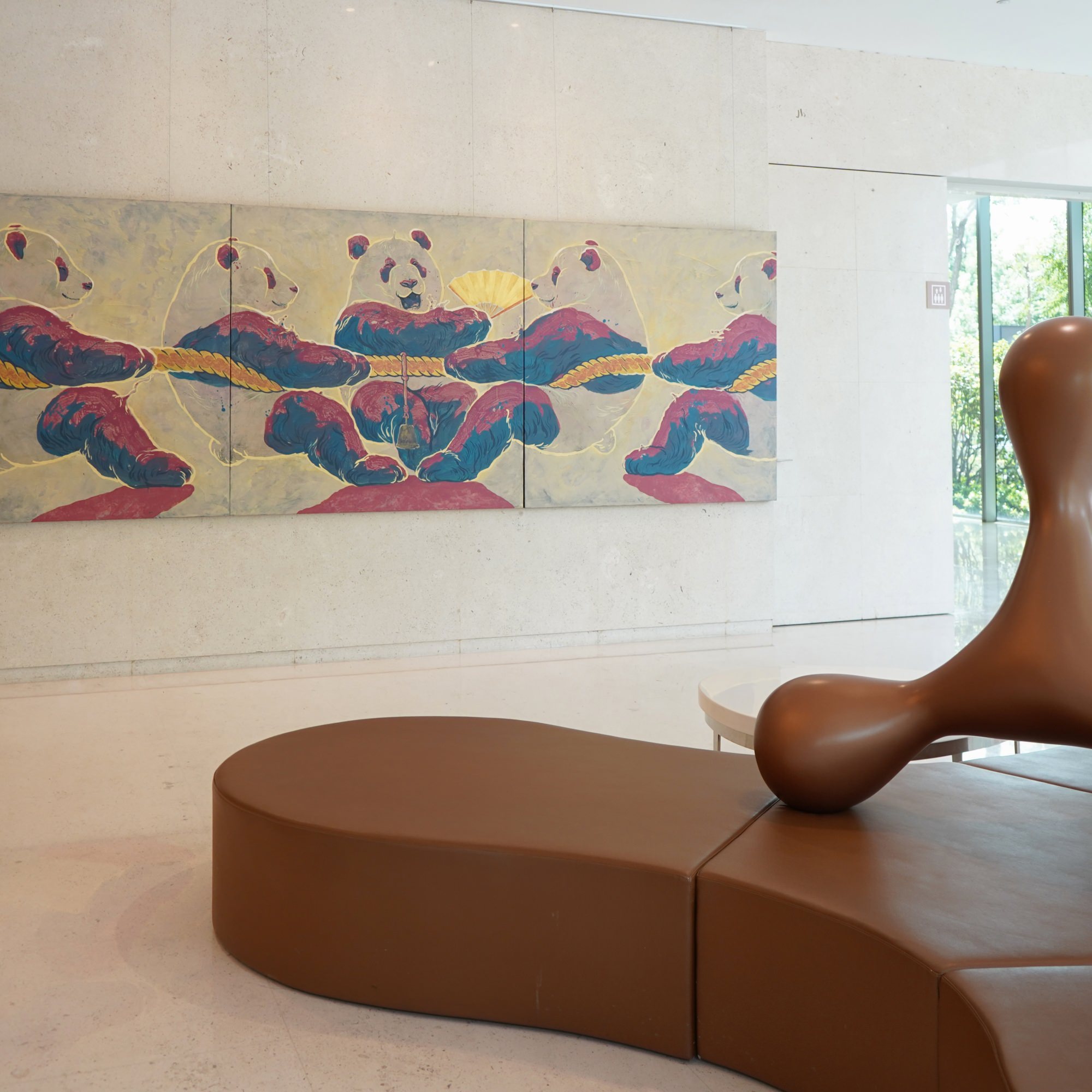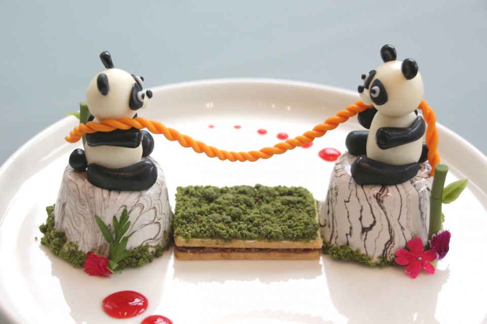 此外,即日起至2022年9月30日止,1F旅覓酒吧獻出同名款藝術甜點,點心坊主廚蘇育民以主畫「嘿呦嘿呦」為靈感,呈現熊貓拔河的趣味場景。其中唯妙唯肖的迷你熊貓、拔河繩以可塑巧克力純手工捏製,而兩個擁有大理石紋路的競技擂台分別是「覆盆子開心果檸檬」、「伯爵蘋果」兩款蛋糕。「覆盆子開心果檸檬」搭配開心果蛋糕、奶油霜及覆盆子、檸檬內餡,入口清爽、美味誘人;「伯爵蘋果」是熬煮伯爵茶、鮮奶後特製而成的慕斯,口感輕盈綿密、茶香淡雅宜人,且蘋果內餡增添果香外、豐富口味層次,而擂台之間以原味餅乾、巧克力巴瑞脆片、抹茶酥波蘿營造出草地意象、更添生動感。